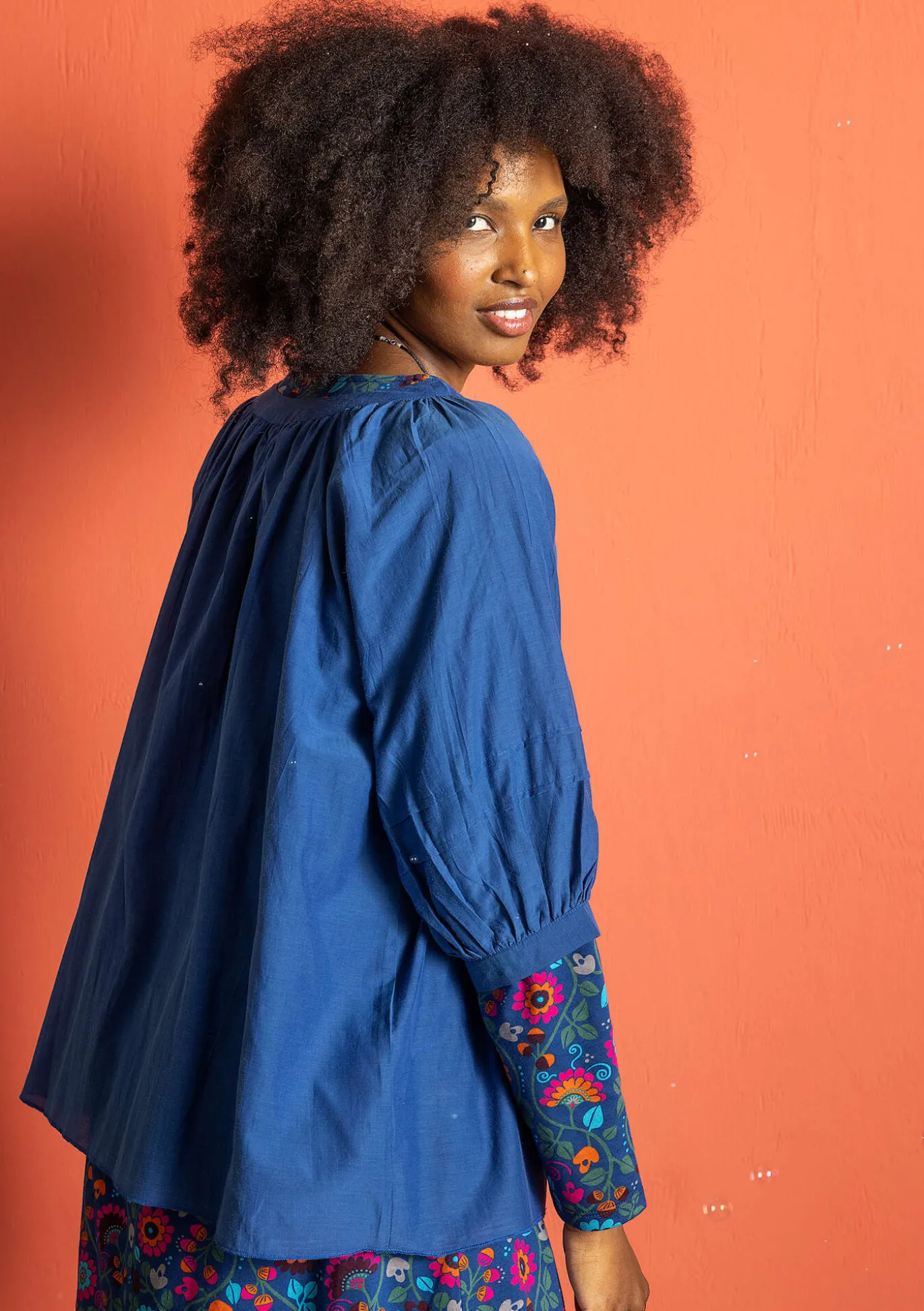 Pludrige Bluse mit großzügiger Weite. Runder Ausschnitt mit angekräuselter Blende. 3/4-Ärmel mit zwei Biesen und angekräuselten Abschlüssen.