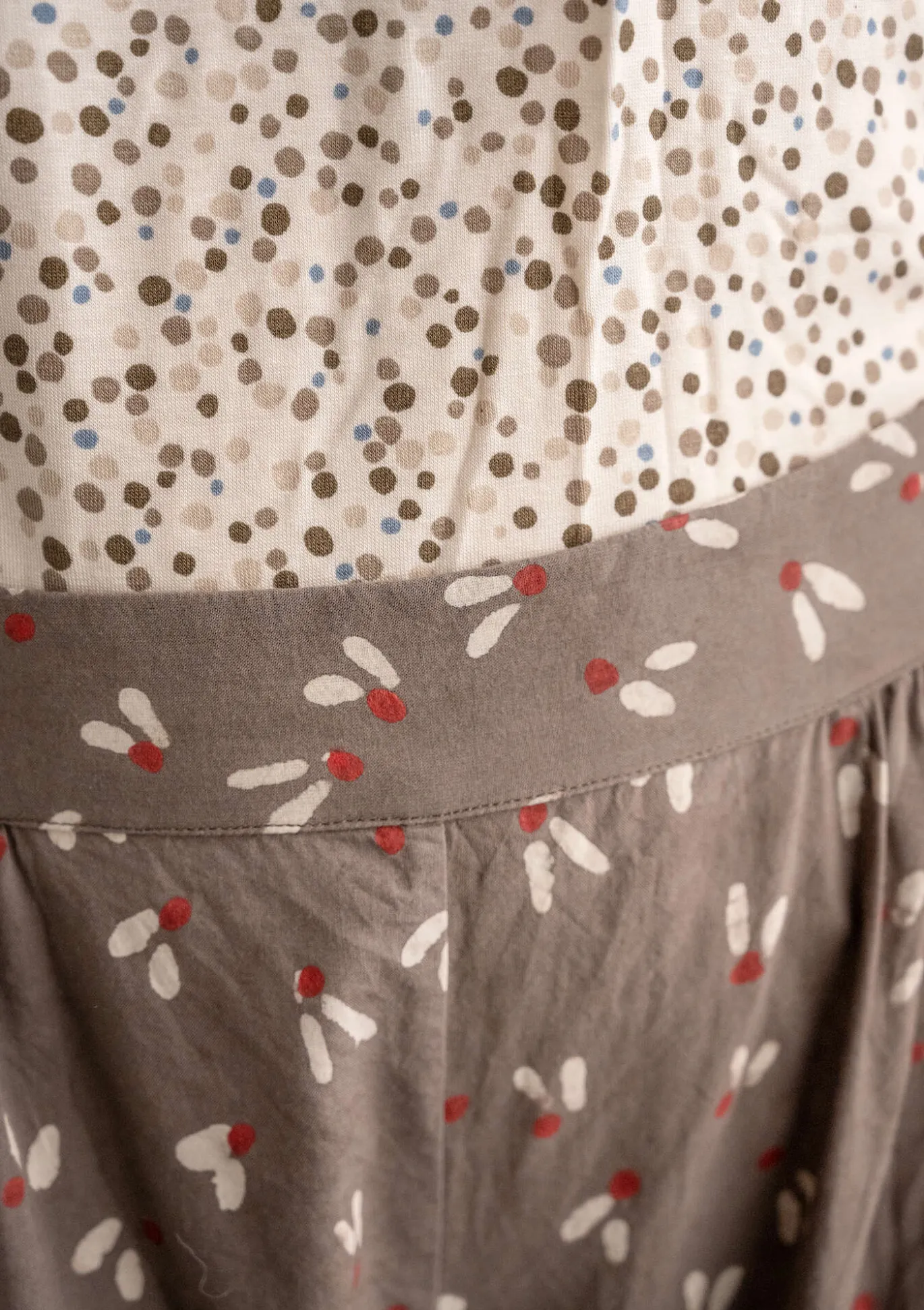 Klein gemusterte Pluderhose, mithilfe von Lehm-Reservage blockbedruckt und in mehrere Farbbäder mit Pflanzenpigmenten getaucht. Modell mit innen liegendem Gummizug im Bund und praktischen Seitentaschen.