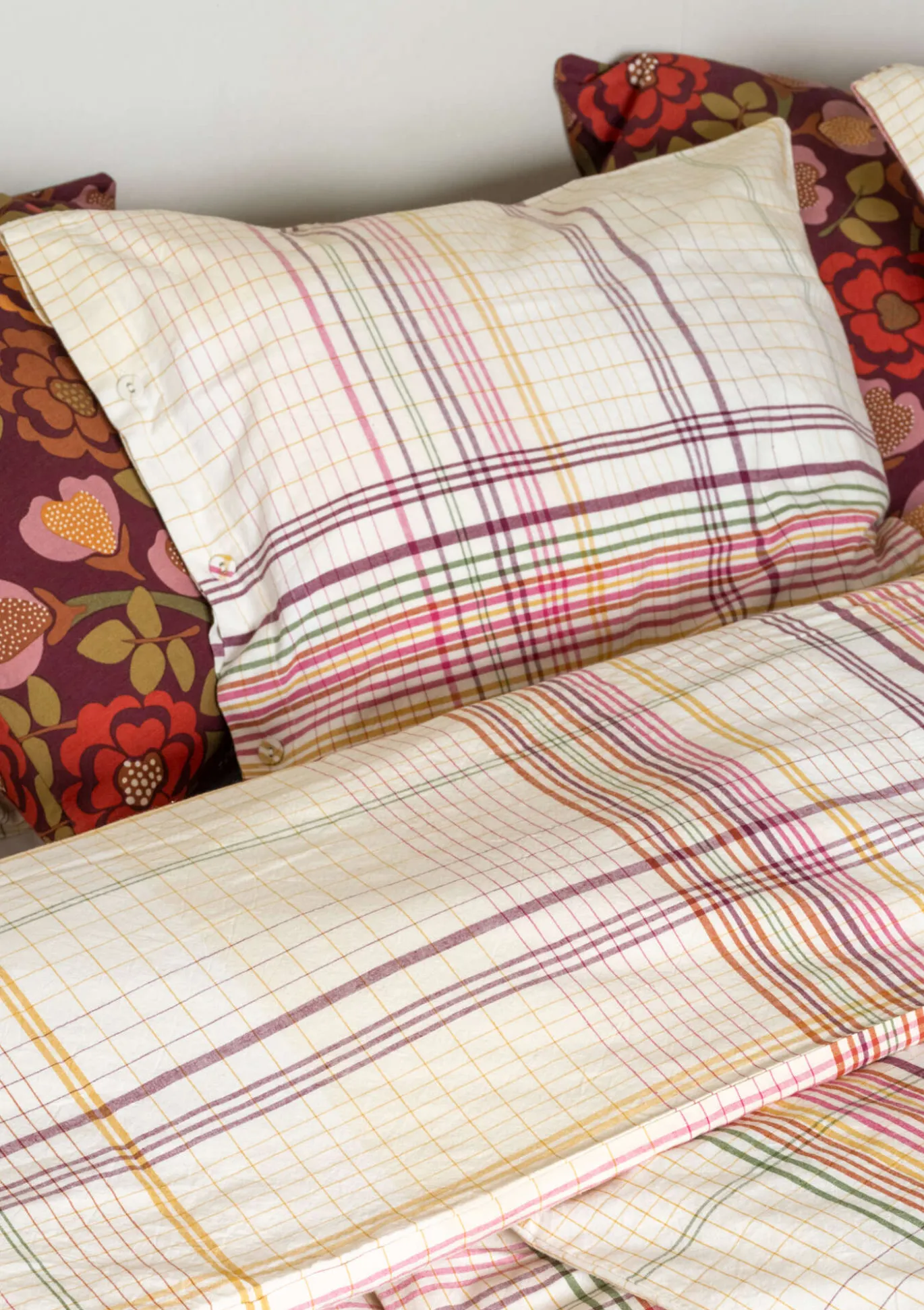 Kopfkissenbezug aus weicher, behaglicher Bio-Baumwolle. Schönes Webkaro mit herrlichem Farbenspiel. Mit seitlichen Stoffknöpfen zu schließen.