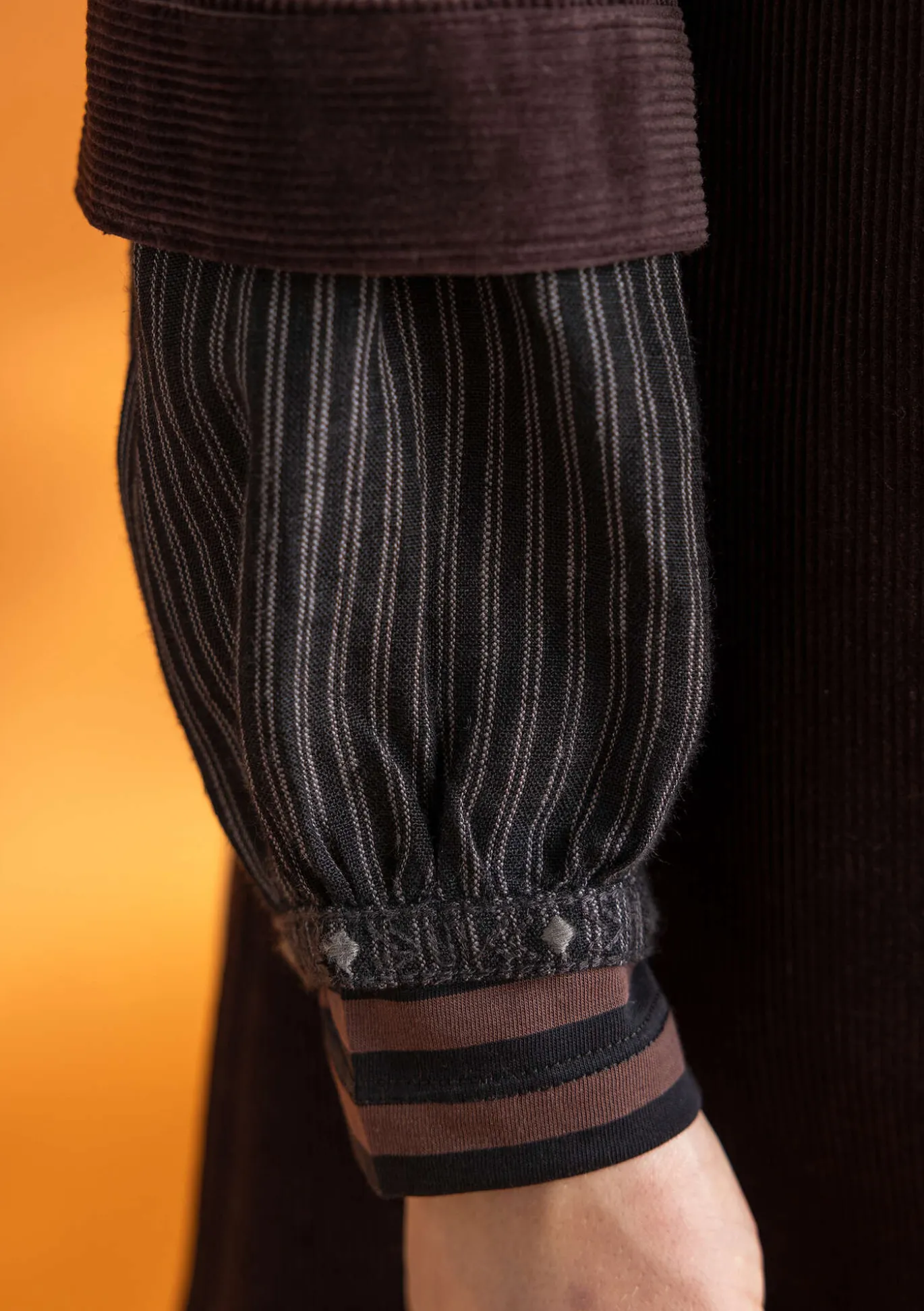 Bluse mit durchgehender Knopfleiste und aufgesetzten Taschen. Sowohl einfarbig als auch mit Webstreifen erhältlich. Passe vorne und hinten. Lange Ärmel mit Stickdetail. Mit Perlmuttknöpfen und Ösen zu schließen. Seitenschlitze.