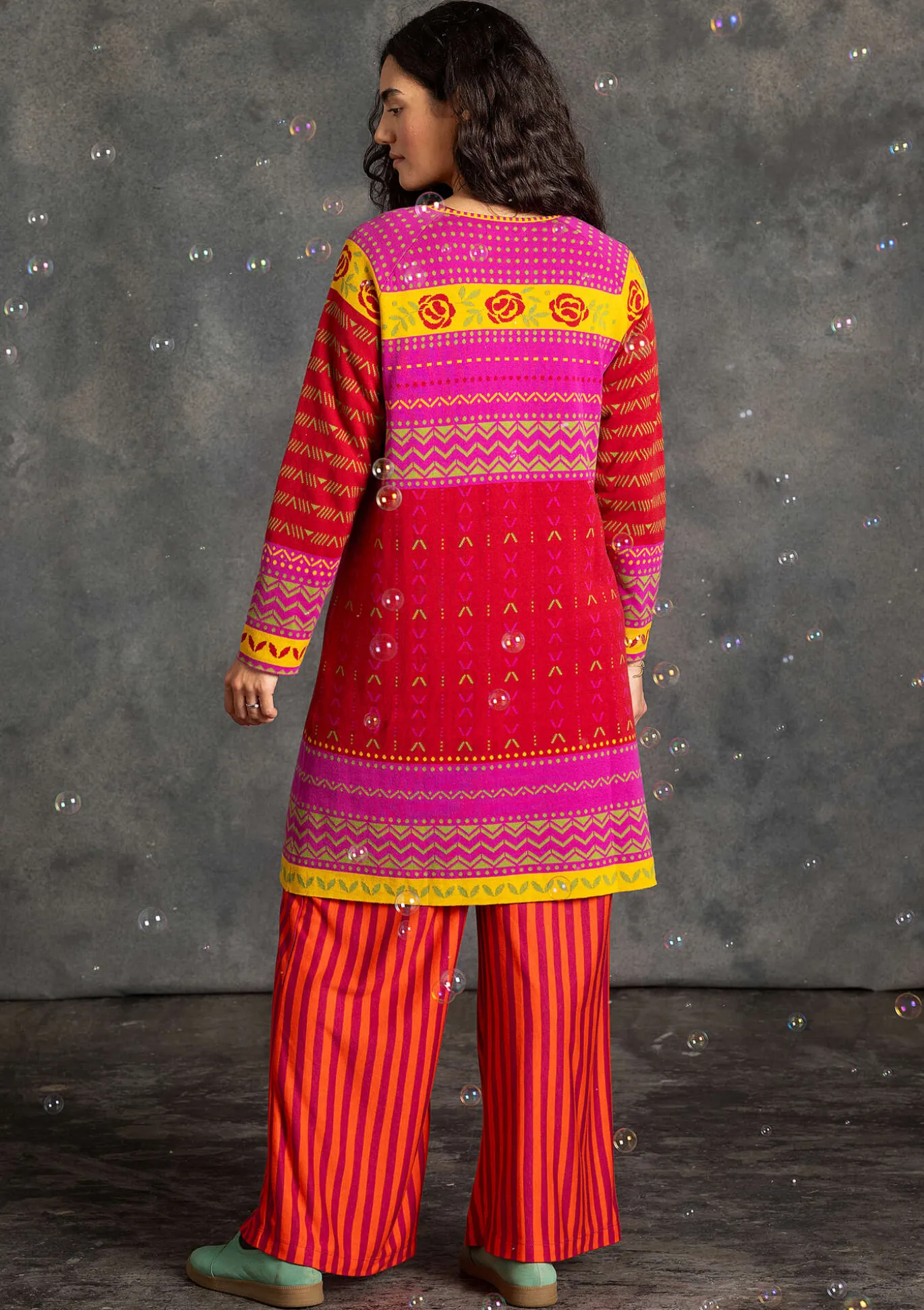 Jacquardstrickkleid mit langen Ärmeln, rundem Ausschnitt und schöner Saumweite. Hübsch gearbeitetes Modell mit umlaufender Rosenbordüre an Ausschnitt und Schulterpartie.