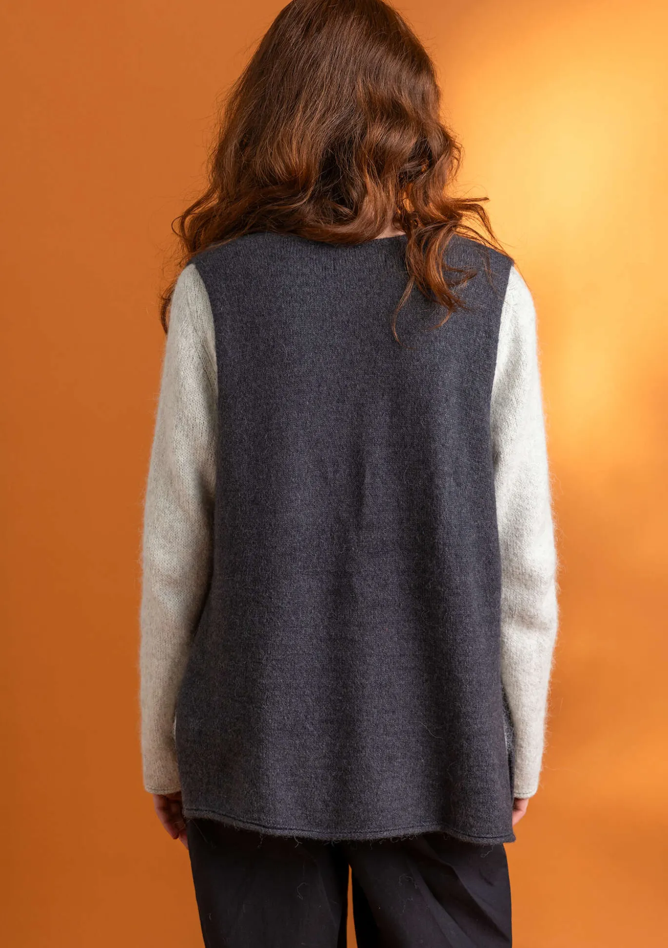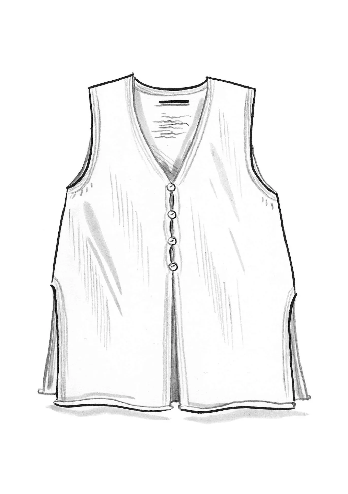 Etwas länger geschnittene Strickweste. Modell aus unserem weichen, flauschigen Melangegarn. Perlmuttknöpfe mit Häkelösen vorne und Schlitze an den Seiten.
