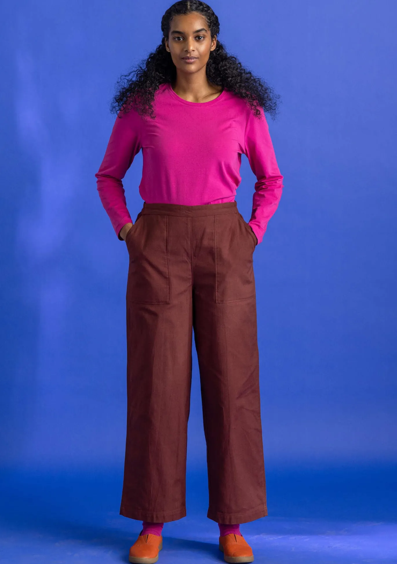 Lange Hose mit praktischen Taschen. Dekorative Dreinadelnähte an den Seiten und Taschenriegel in Akzentfarbe. Bequemer Dehnbund hinten und Printdetail auf der Bundinnenseite.