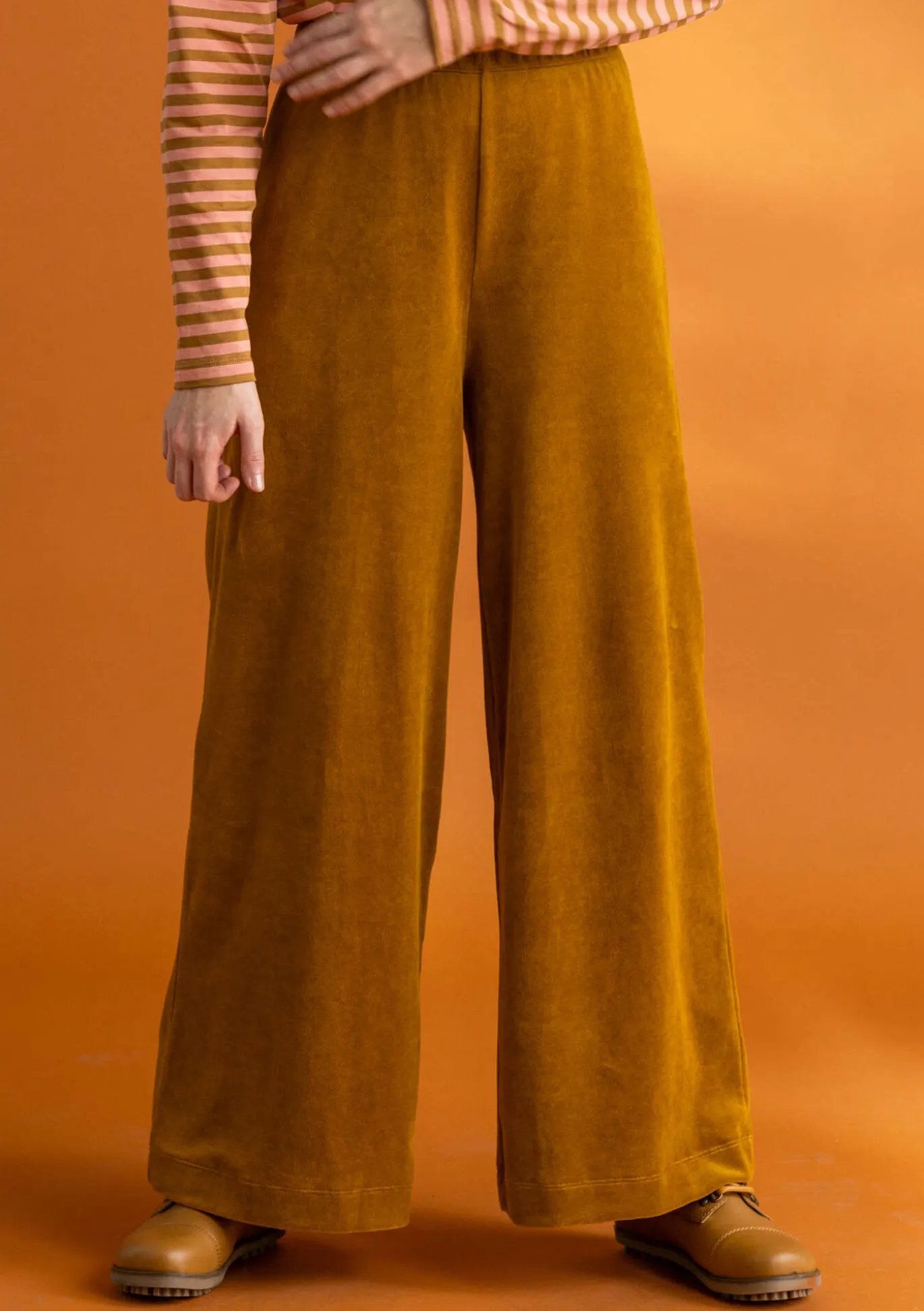 Lange Hose aus unserem weichen einfarbigen Velours. Innen liegender, bequemer Gummizug im Bund. Behagliches, wärmendes Modell in intensiven Farben.