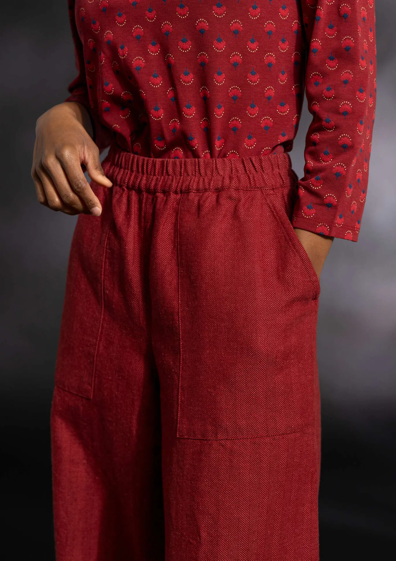 Lange Hose aus Fischgrat. Modell mit bequemem Dehnbund und schöner Beinweite. Aufgesetzte Taschen vorne. Aus Reststoff gearbeitet.