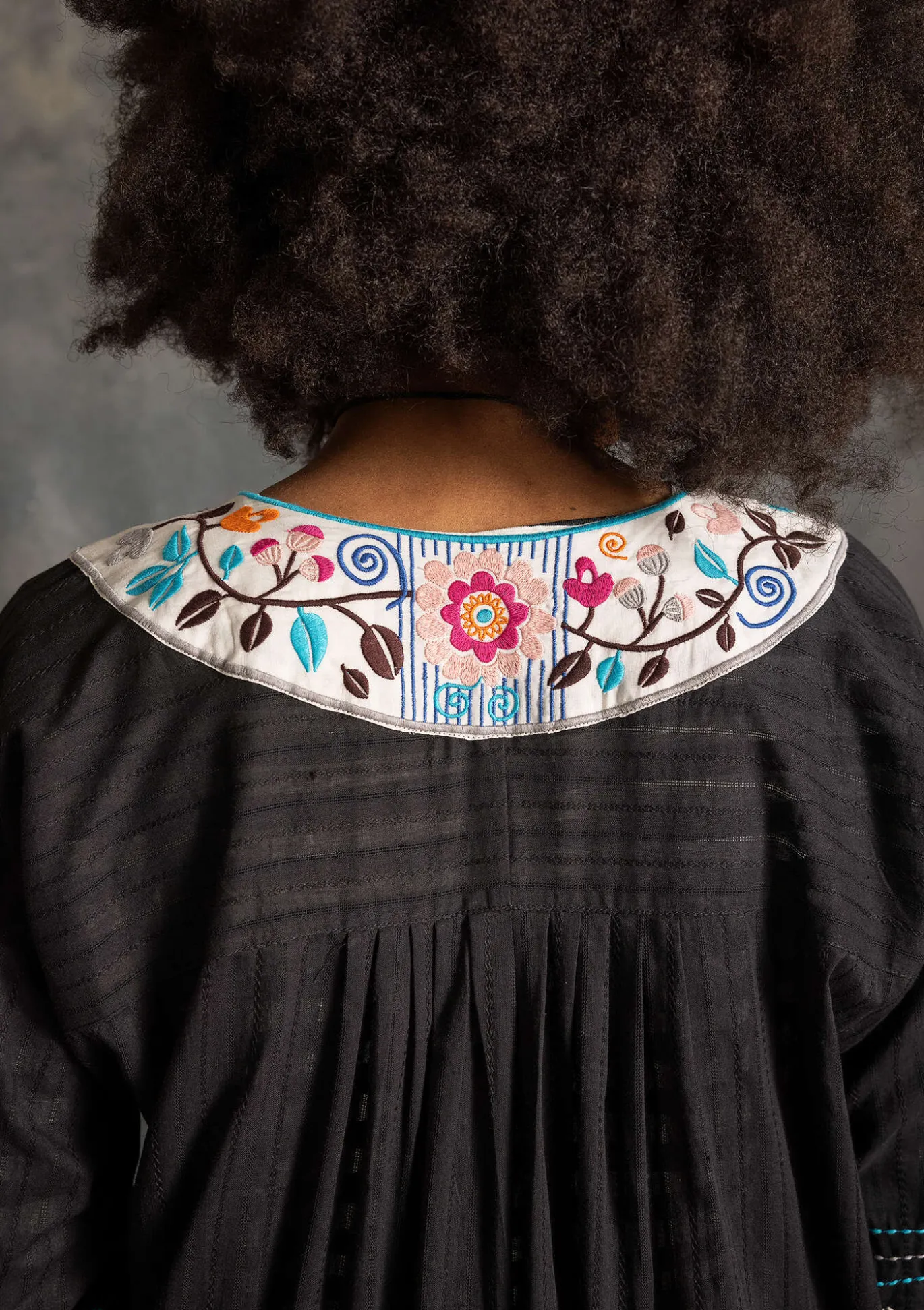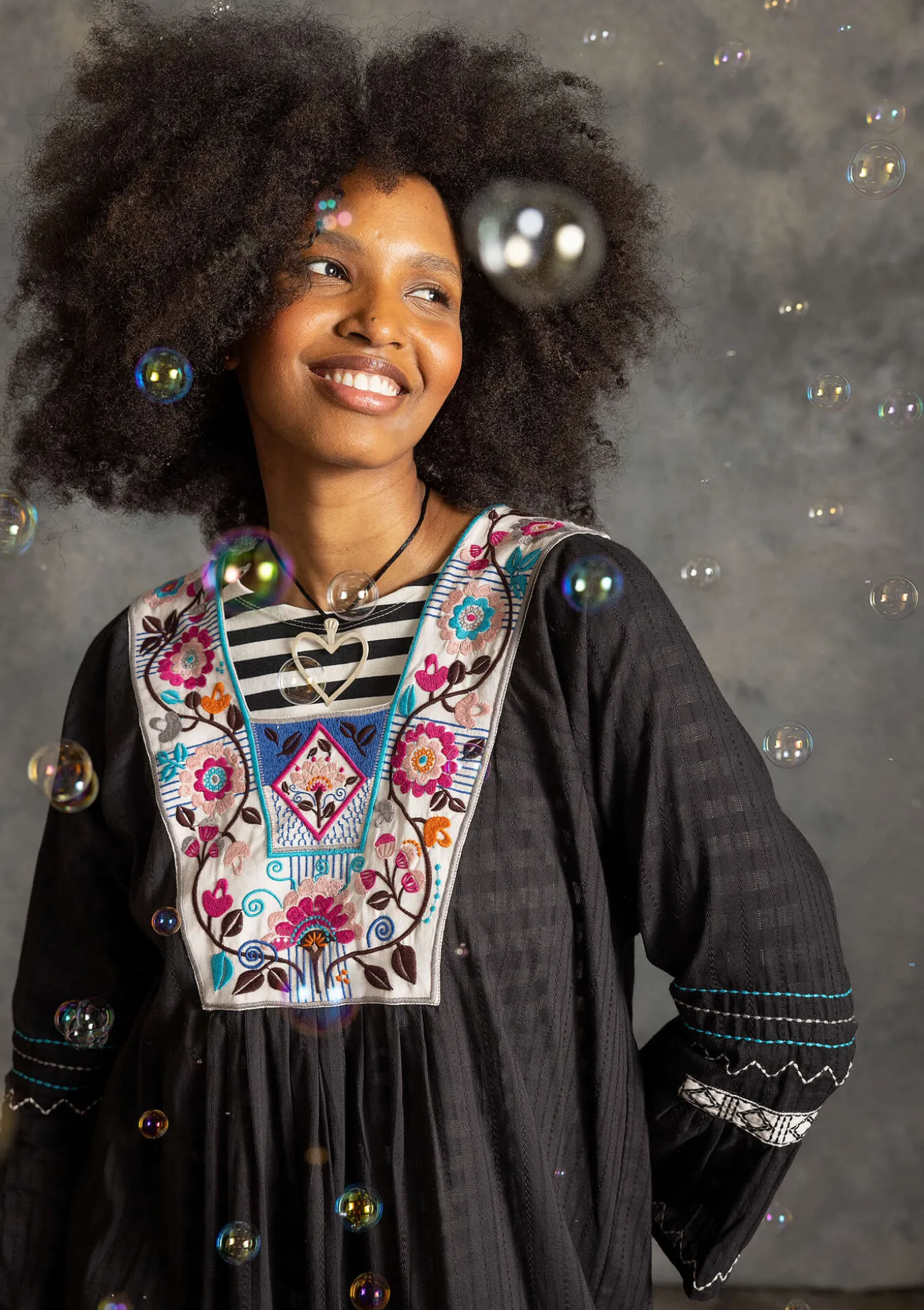 Üppig verziertes Kleid mit herrlichen Bordüren, blütenbestickter Passe und eckigem Ausschnitt. Die Kräuselung unter der Brust sorgt für eine schöne Saumweite und für hohen Tragekomfort. Etwas längere 3/4-Ärmel, verziert mit Teilungsnaht und abgesteppten Falten, aufgenähten Bändern und Stickerei.