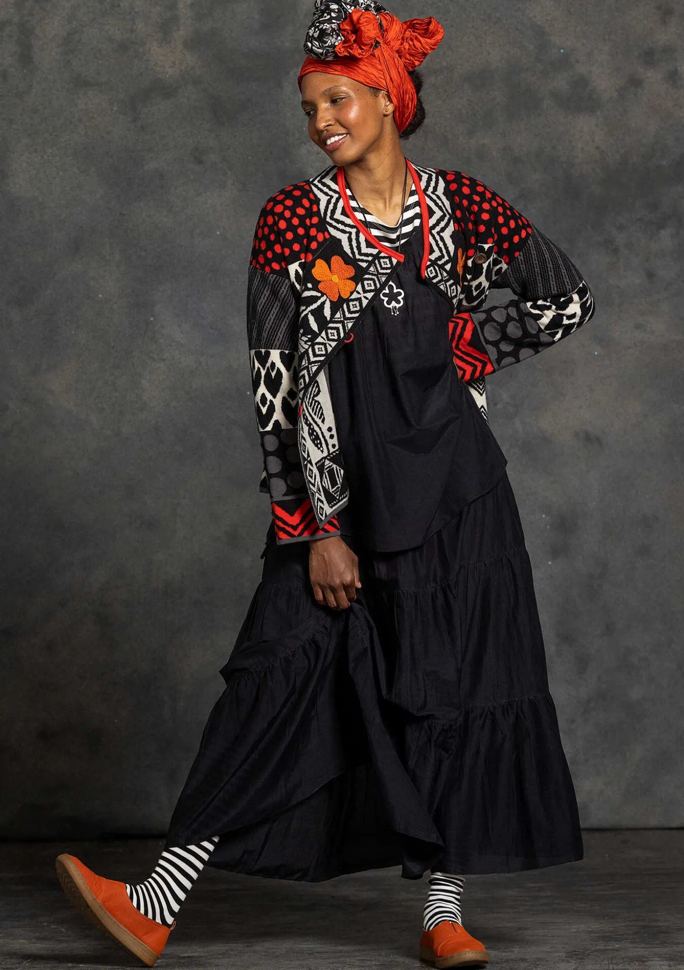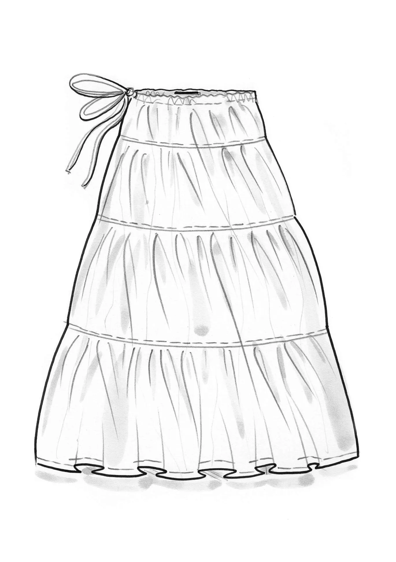 Weiter Rock aus einem herrlichen Baumwolle/Seide-Gewebe mit schönem Fall. Hübsches Modell mit vier Stufen und Tunnelzug im bequemen Dehnbund.