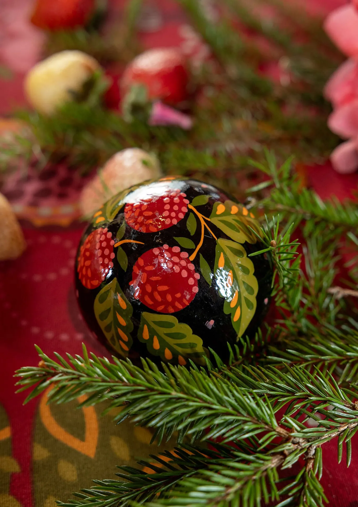 Unsere klassische handbemalte Weihnachtskugel aus Papiermaschee. Zu haben in verschiedenen Farben und Mustern, die das Zuhause verschönern. Goldfarbener Aufhänger.