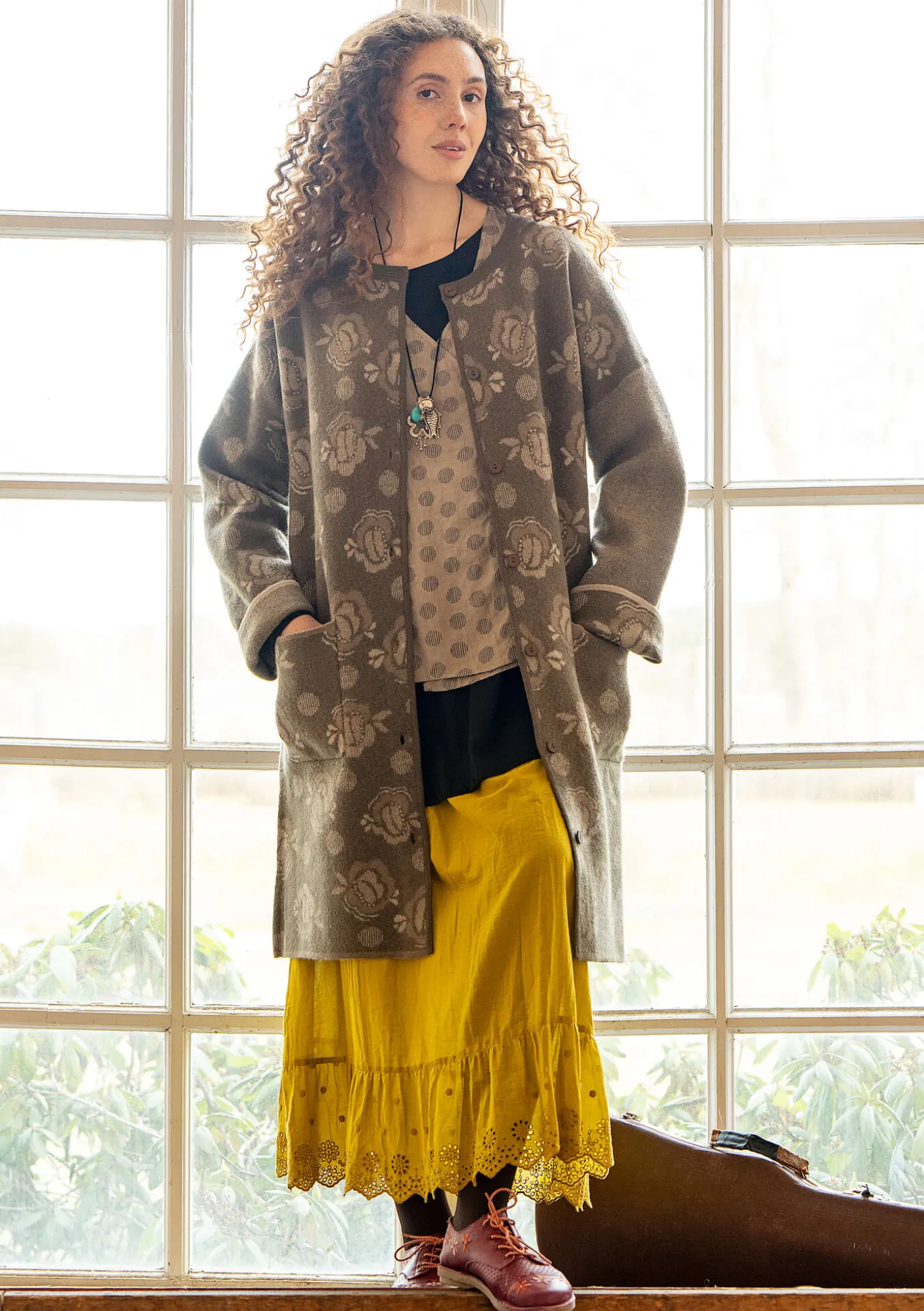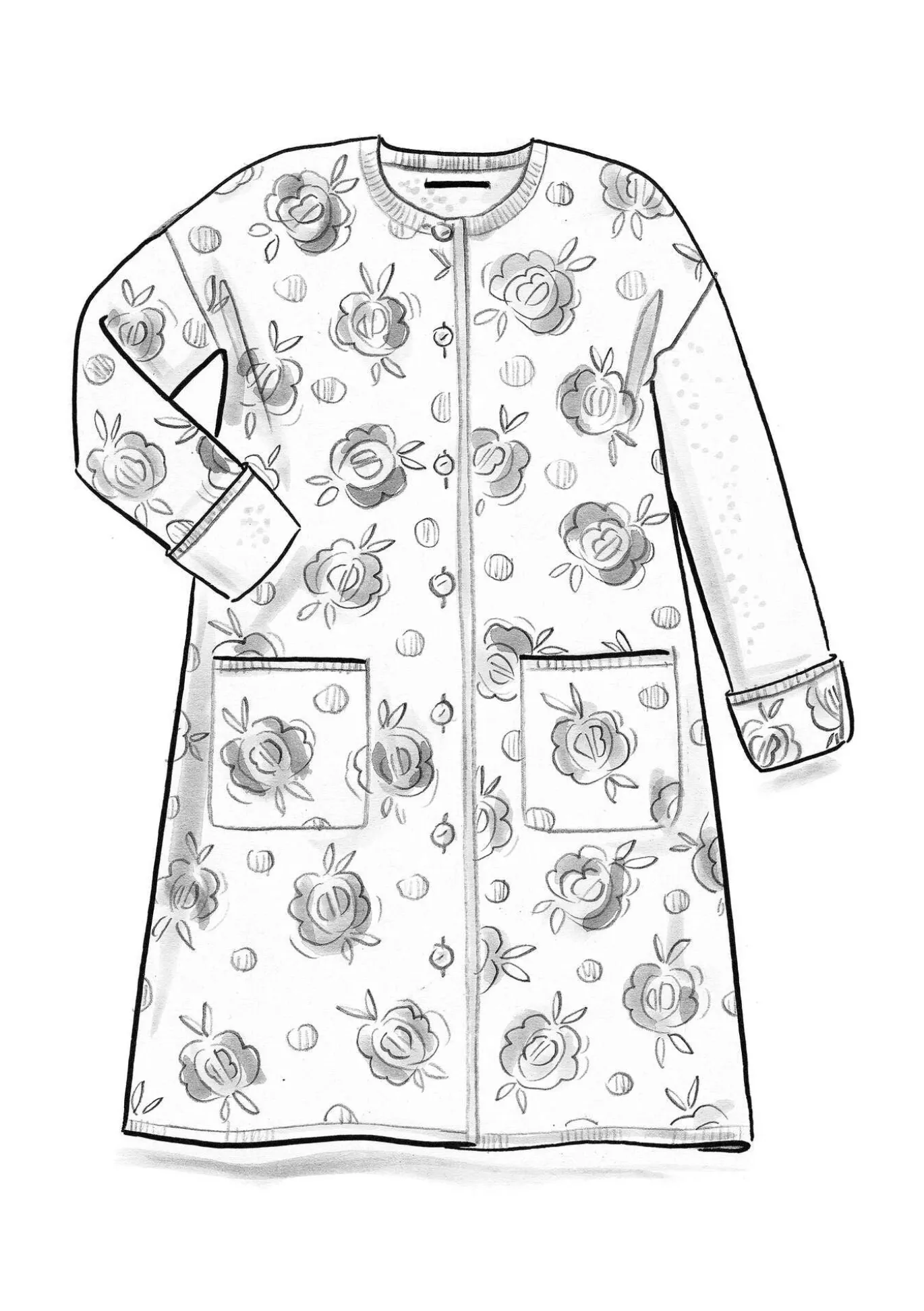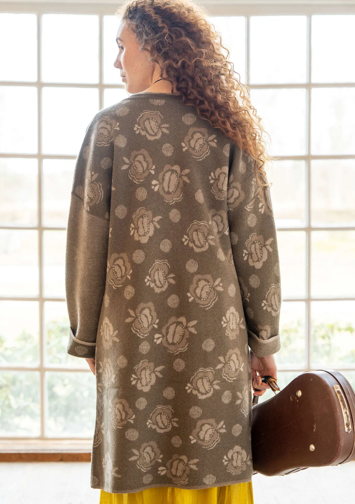 Wendbarer Jacquardstrickmantel aus gefilzter Bio-Wolle. Eine Seite mit Rosenmuster, die andere einfarbig mit Melangeeffekt. Ein Ärmel mit umgekehrten Seiten. Modell mit überschnittenen Schultern und rundem Ausschnitt. Zwei aufgesetzte Taschen auf jeder Mantelseite.