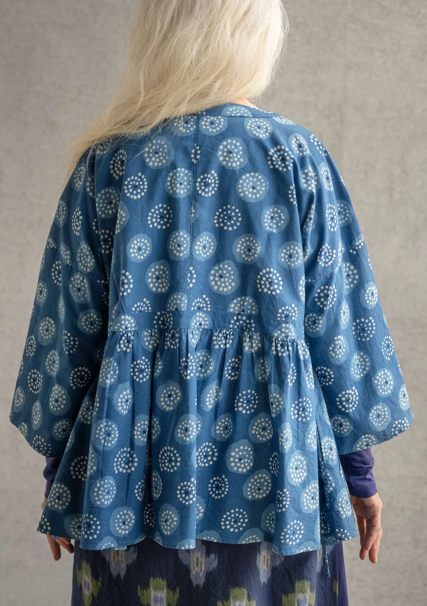 Überlappend gearbeitete Bluse mit 3/4-Ärmeln, überschnittenen Schultern, seitlichen Bindebändern und Seitentaschen. Auf handwerkliche Art gefertigte Bluse, mithilfe von Lehm-Reservage blockbedruckt und mit verschiedenen Pflanzenpigmenten gefärbt. Schöne Verarbeitung mit garnumwickelten Enden an den Bindebändern.