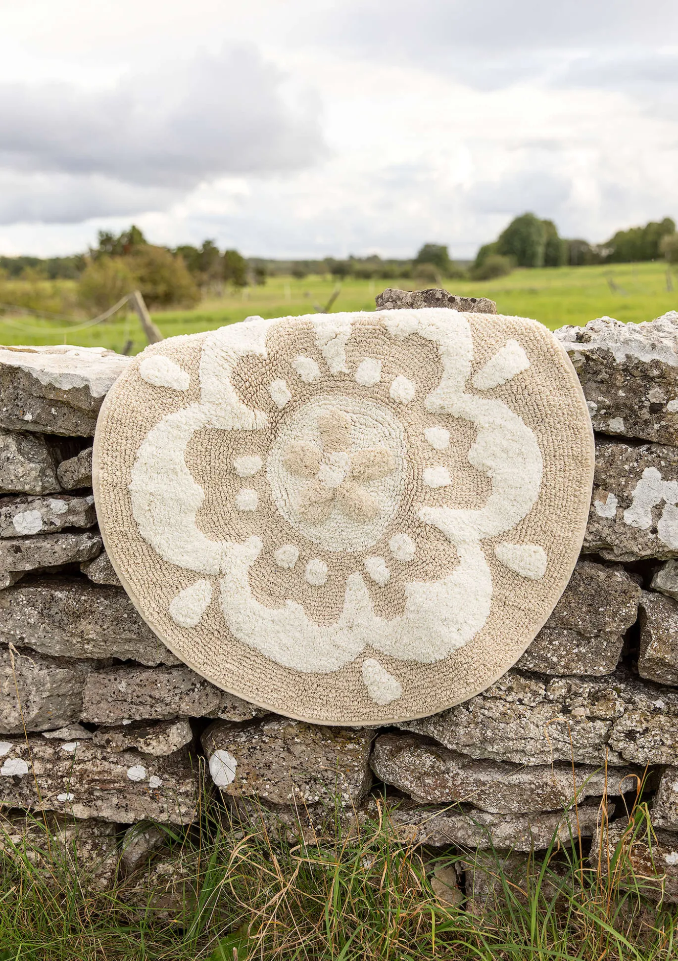 Runder Badteppich mit einer großen Blüte. Getuftetes Modell mit Schlingen und geschnittenem Flor. Rutschfeste Unterseite.