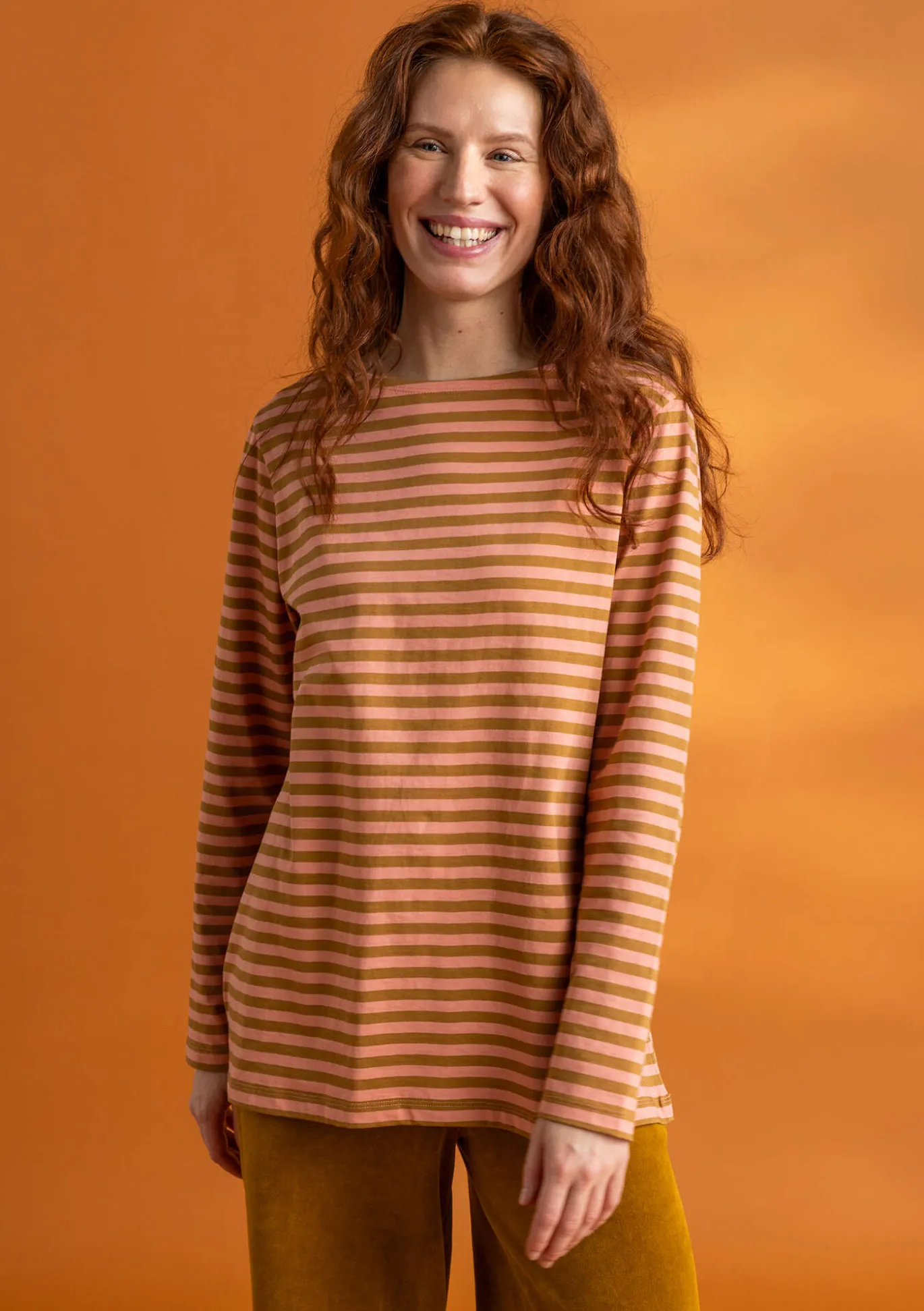 Schlichtes Langarmmodell mit garngefärbten Streifen. Angedeuteter U-Boot-Ausschnitt mit umlaufender Zweinadelnaht.
