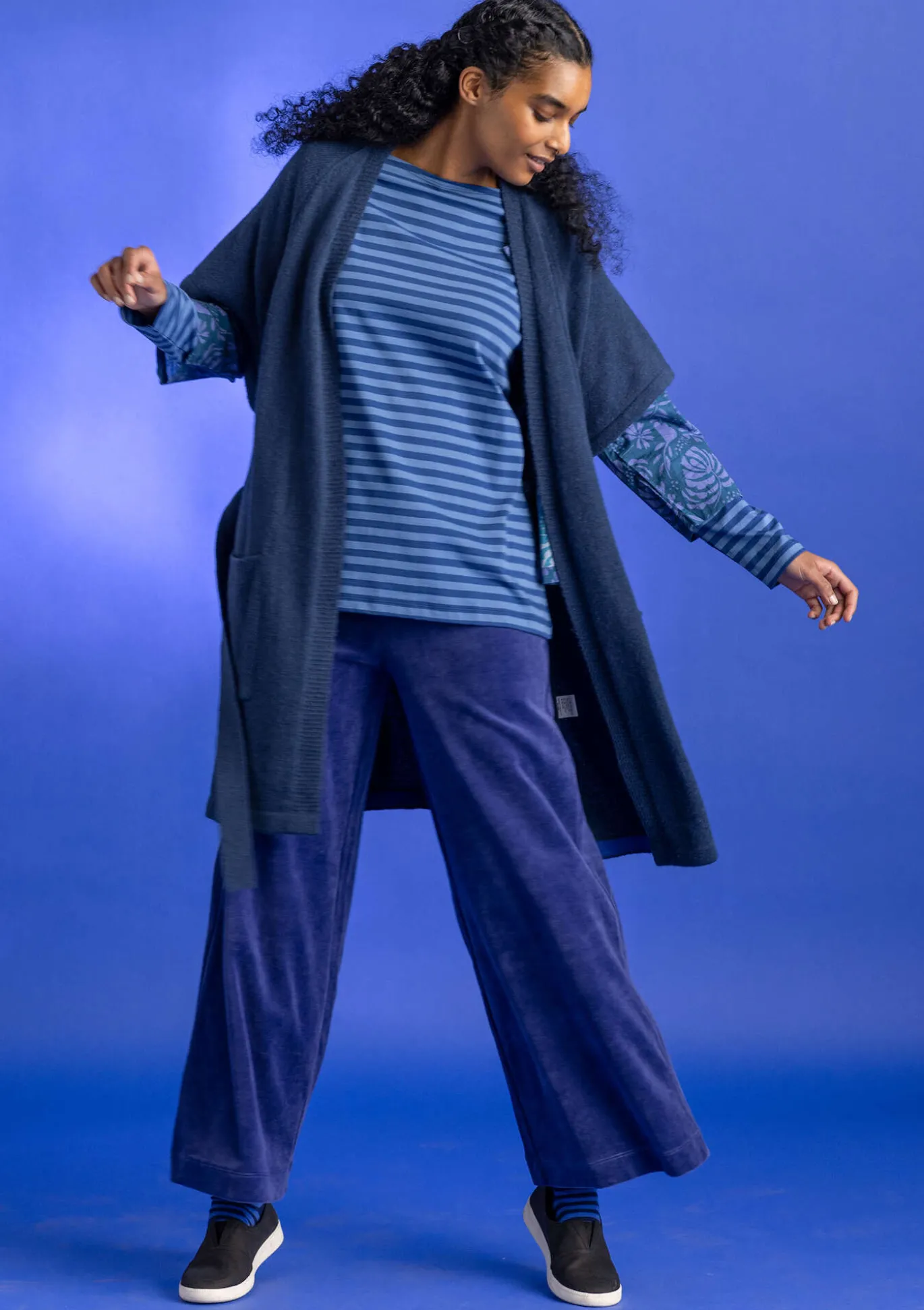 Schlichtes Langarmmodell mit garngefärbten Streifen. Angedeuteter U-Boot-Ausschnitt mit umlaufender Zweinadelnaht.