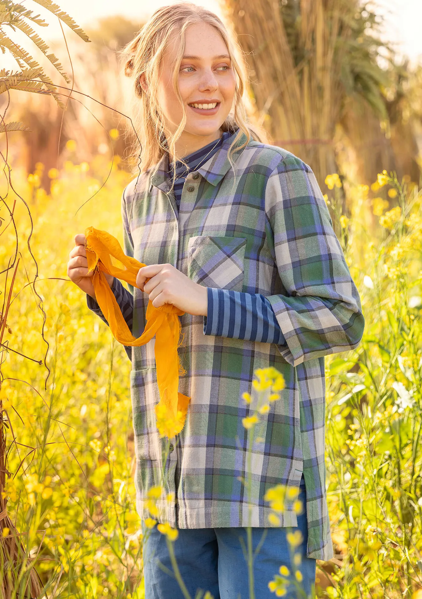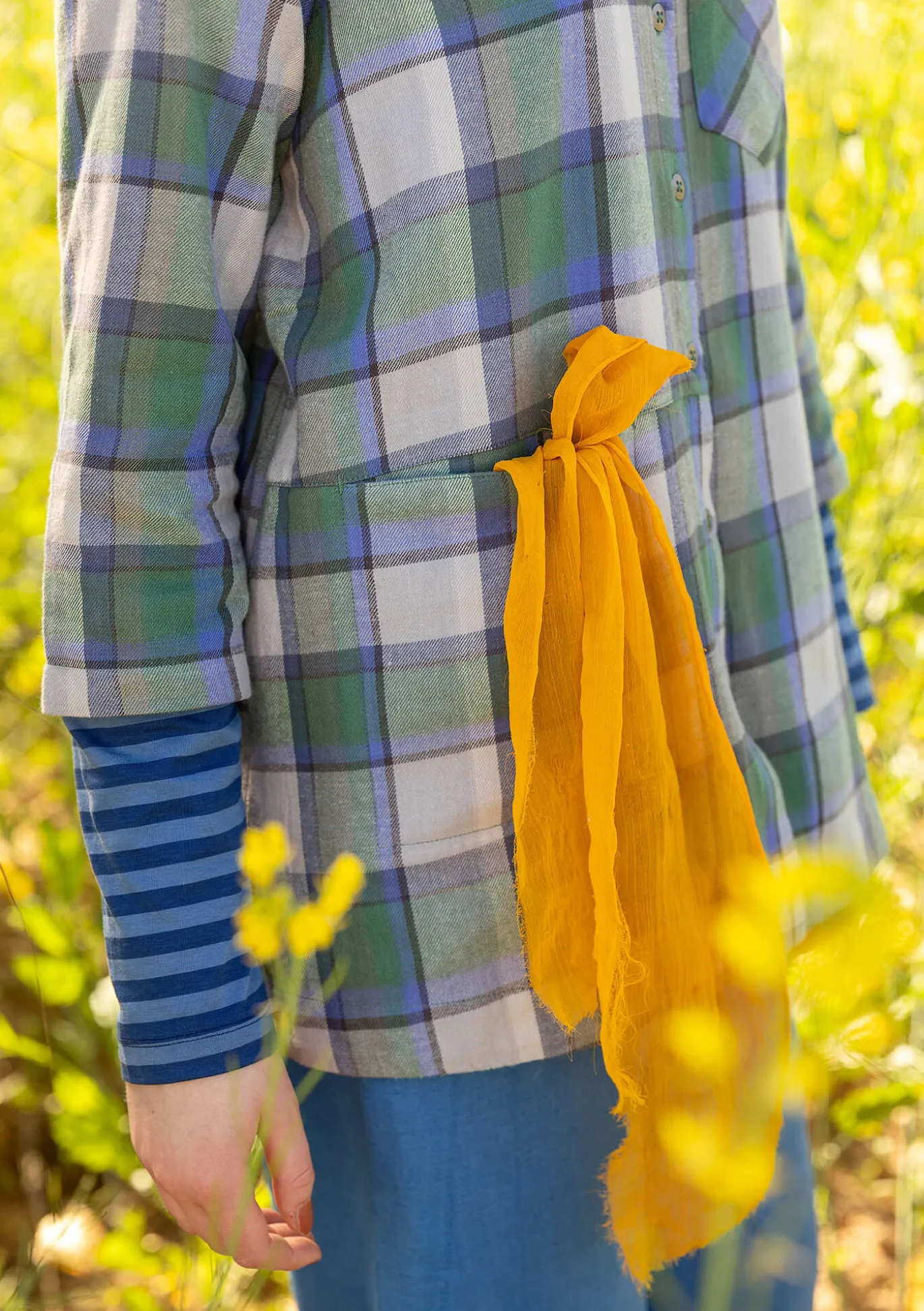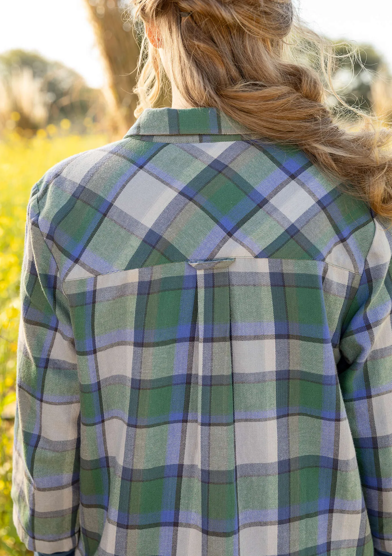 Flanellbluse mit garngefärbtem Karo. Hinten etwas länger geschnittenes Modell mit durchgehender Knopfleiste. Metallknöpfe, Hemdkragen, Seitenschlitze und 3/4-Ärmel. Eine eingesetzte Tasche sowie eine aufgesetzte Tasche vorne. Schulterpasse an Vorder- und Rückenteil mit diagonalem Karodessin. Kellerfalte und dekorative Schlaufe in der Rückenmitte.