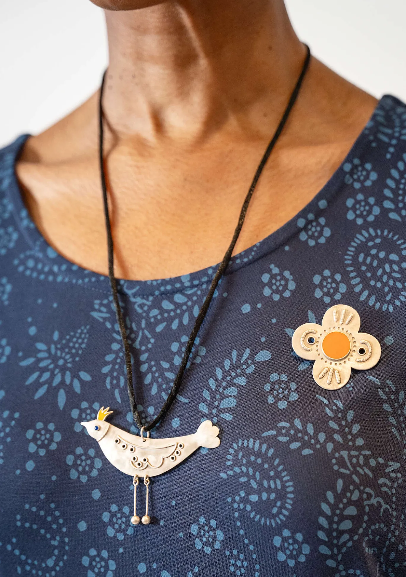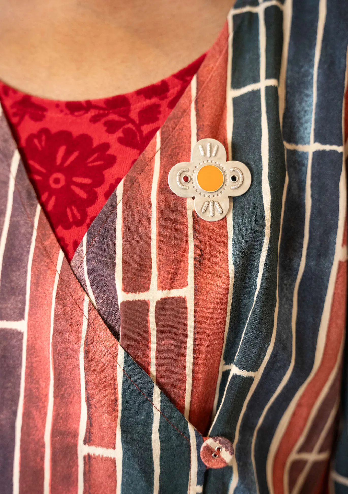 Dekorative Relief-Brosche in Form einer klassischen Gudrun-Blume, aus 925er-Sterlingsilber mit emaillierten Details. Das perfekte Accessoire, ob zu festlichen Gelegenheiten oder im Alltag. Mit einer Nadel auf der Rückseite zu befestigen. Verpackt in einem kleinen Stoffbeutel mit Musterdruck.