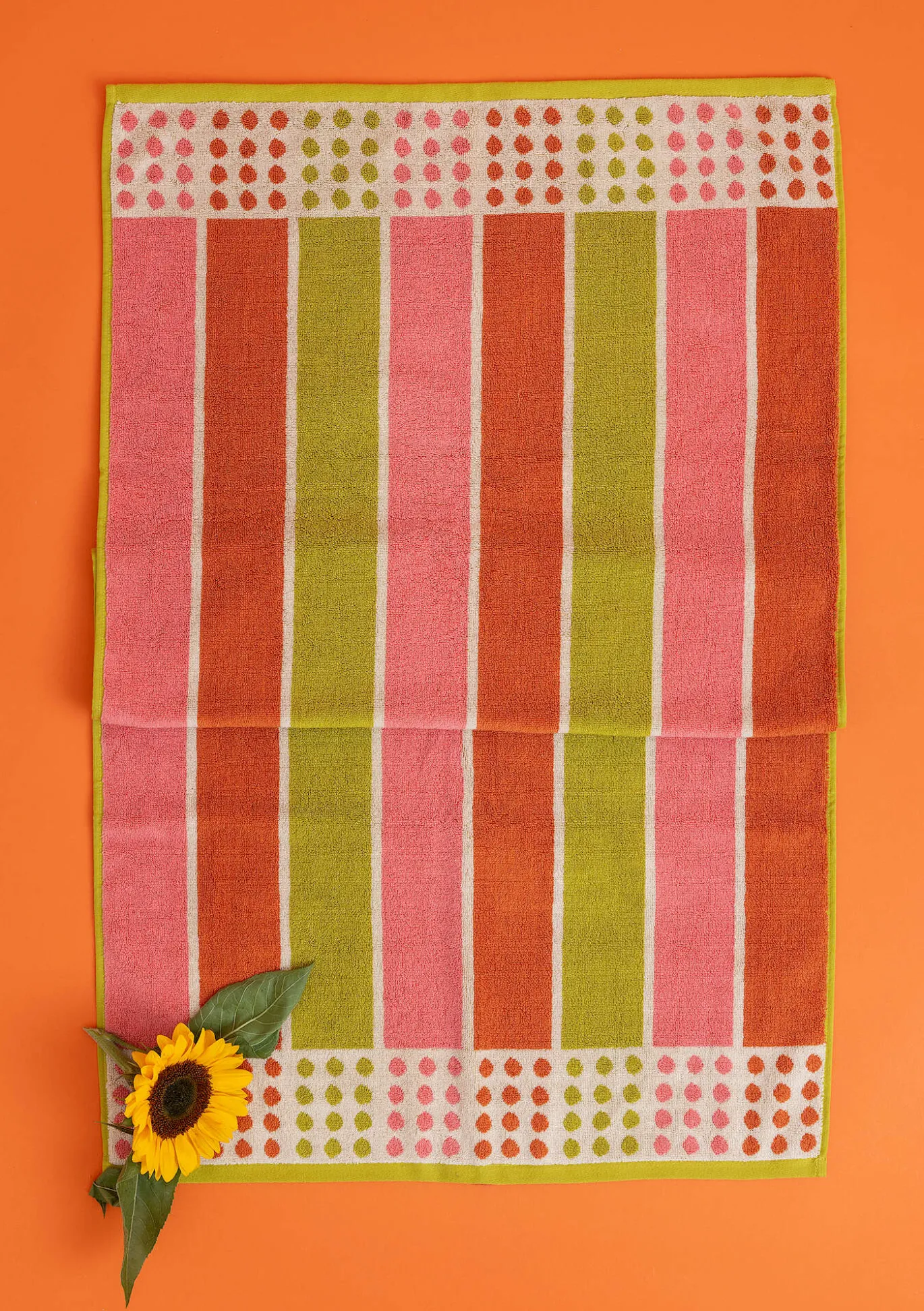 Duschhandtuch mit Streifen und Punktebordüren. Kontrastierende Kanten und Aufhänger an der Stirn- und Längsseite.