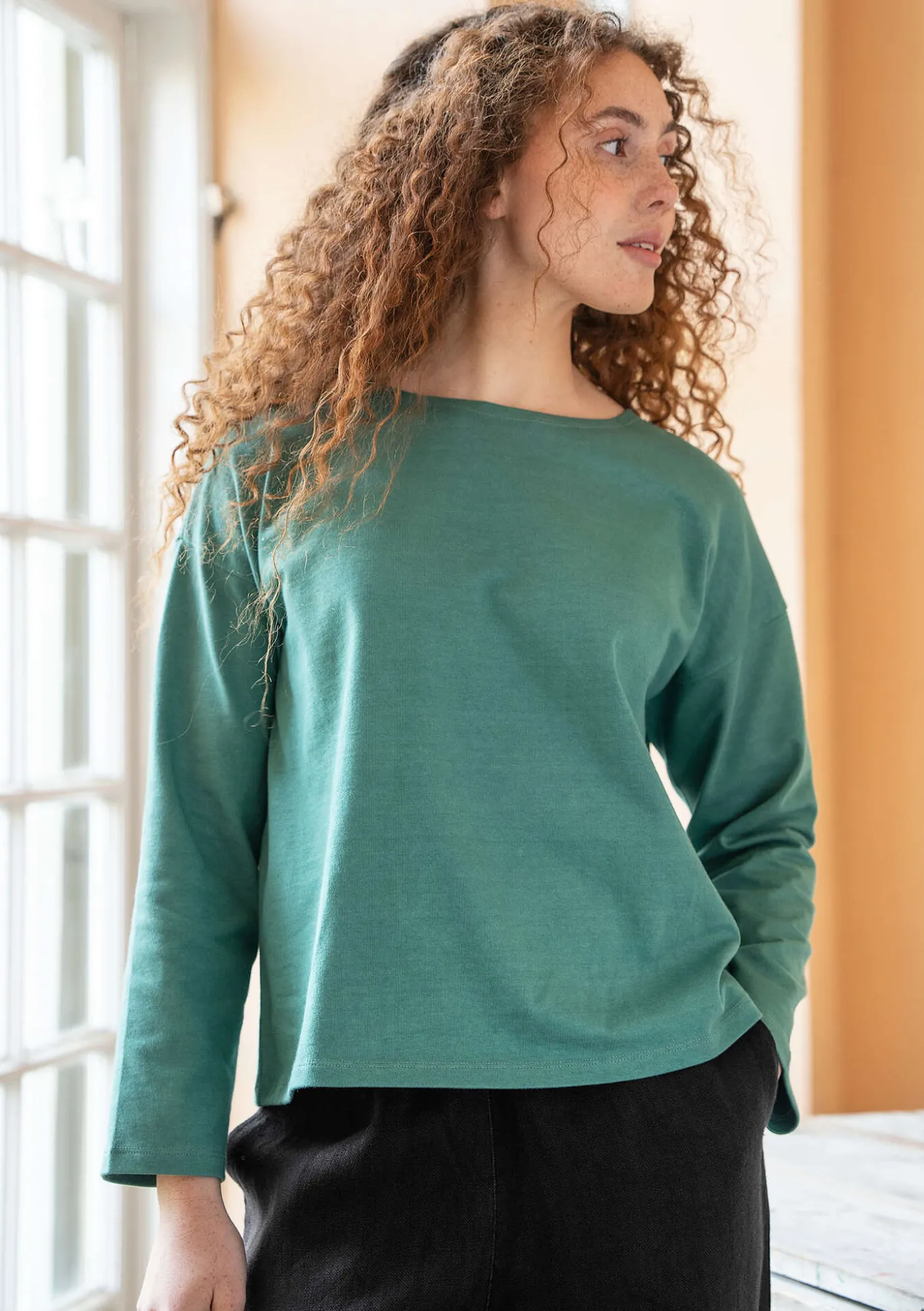 Shirt aus einer etwas kräftigeren Singlejersey-Qualität. Einfarbiges, schlichtes und leicht kastiges Modell mit sanftem U-Boot-Ausschnitt und langen Ärmeln.