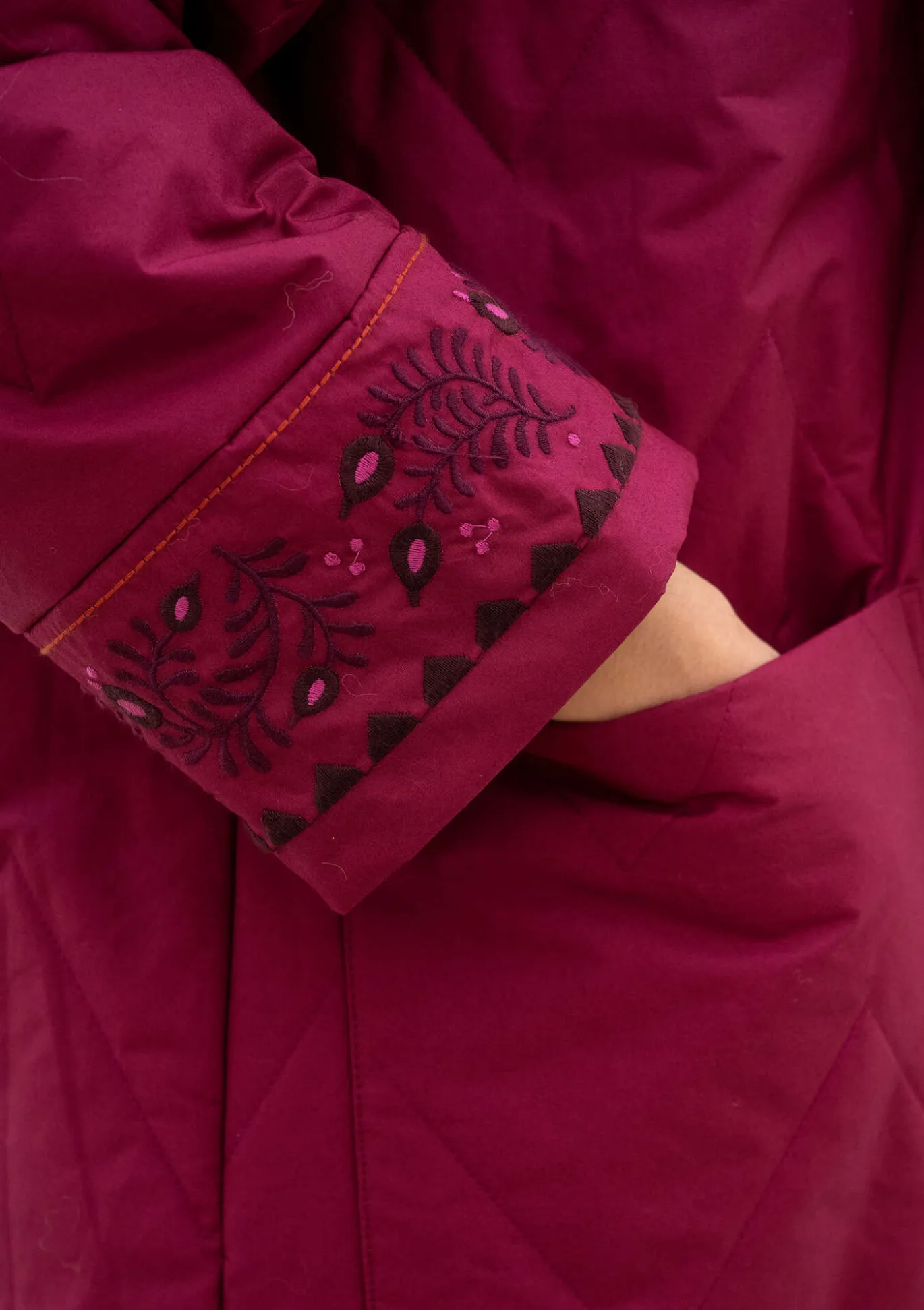 Durchgehend gefütterter Steppmantel mit langen Ärmeln und per Druckknöpfen verstellbaren Seitenschlitzen. Verdeckter Reißverschluss mit Knopfleiste vorne in der Mitte. Große Taschen und verdeckte Ärmelbündchen. Dekorative Stickereien an Ärmelabschlüssen, Kragen und Kapuze.