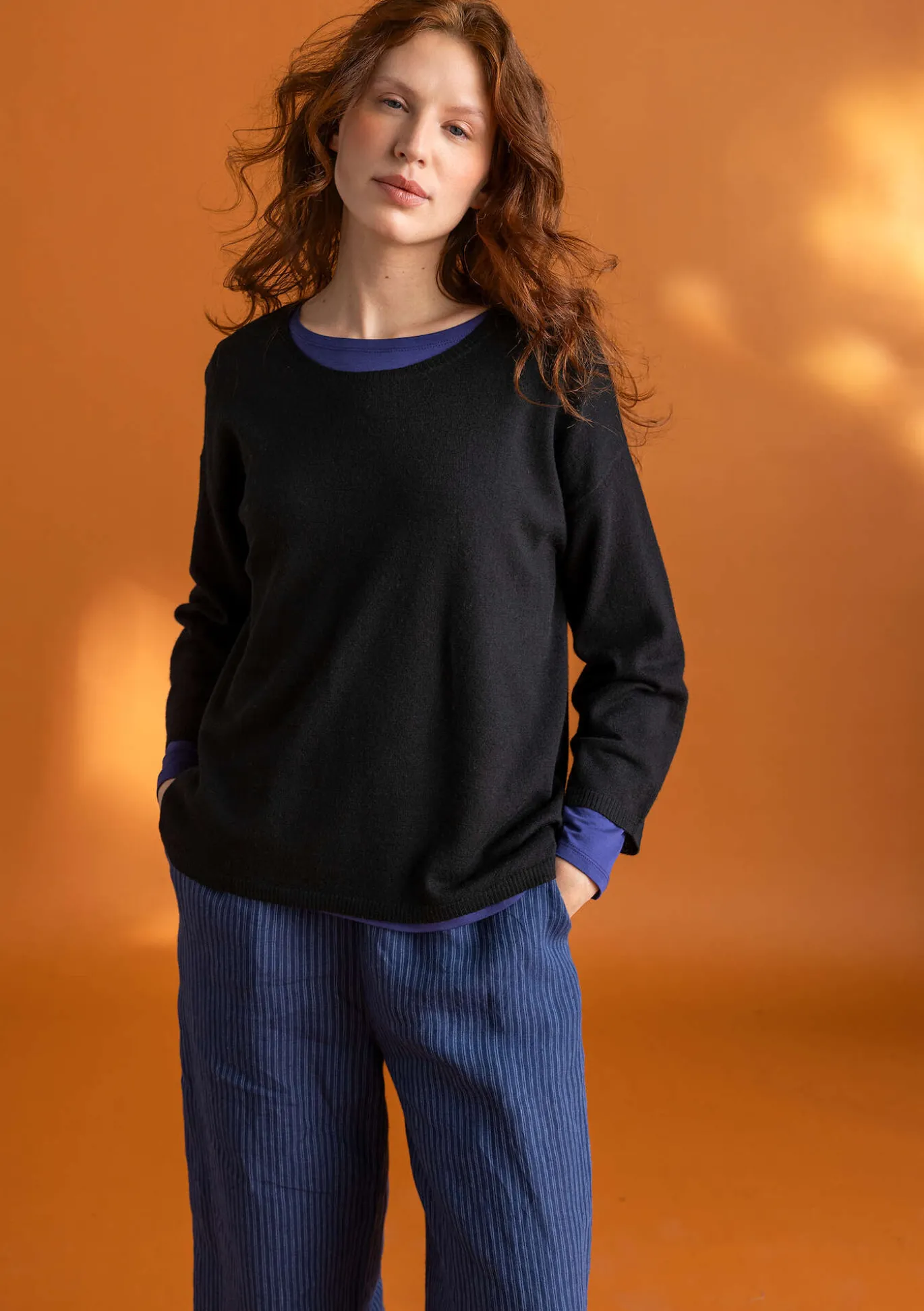 Schön fallende Hose aus Leinen. Einfarbig und mit Webstreifen zu haben. Modell mit schlichtem Dehnbund und normaler Beinlänge. Gerade, weite Beine und praktische Seitentaschen.