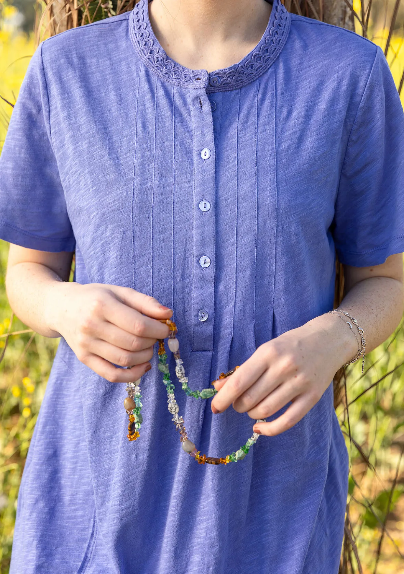 Kurzarmmodell mit Seitentaschen und breitem Volant am Saum. Knopfleiste mit gefärbten Perlmuttknöpfen und kleiner Stehkragen mit romantischer Spitze. Biesen vorne und hinten, für eine Silhouette mit schöner Saumweite.