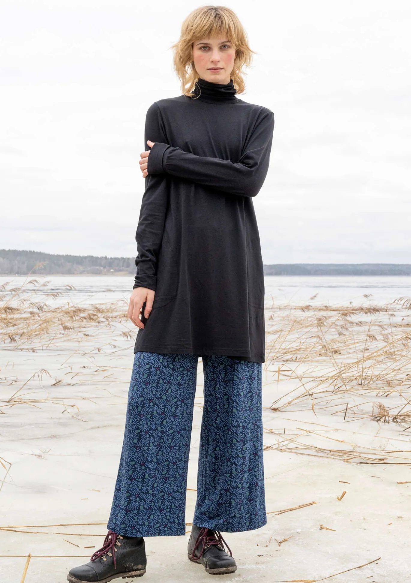 Einfarbige Jerseytunika in A-Linie, mit Rollkragen und Taschen in den Seitennähten. Umschlagbare Ärmelbündchen.