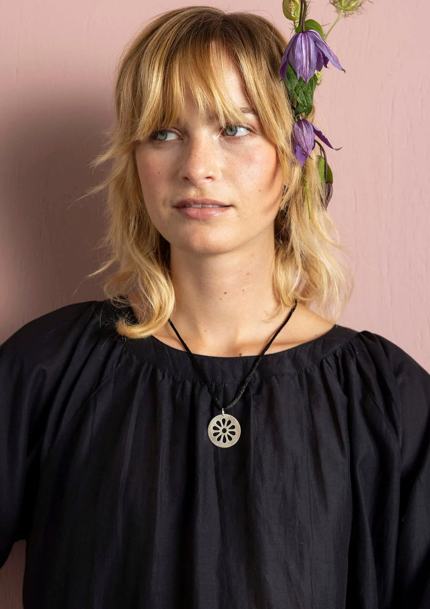 Exklusiver runder Kettenanhänger aus 925er-Sterlingsilber, verziert mit einer ausgestanzten Blüte. 62 cm lange Schnur mit Silberverschluss. Verpackt in einem kleinen Stoffbeutel.