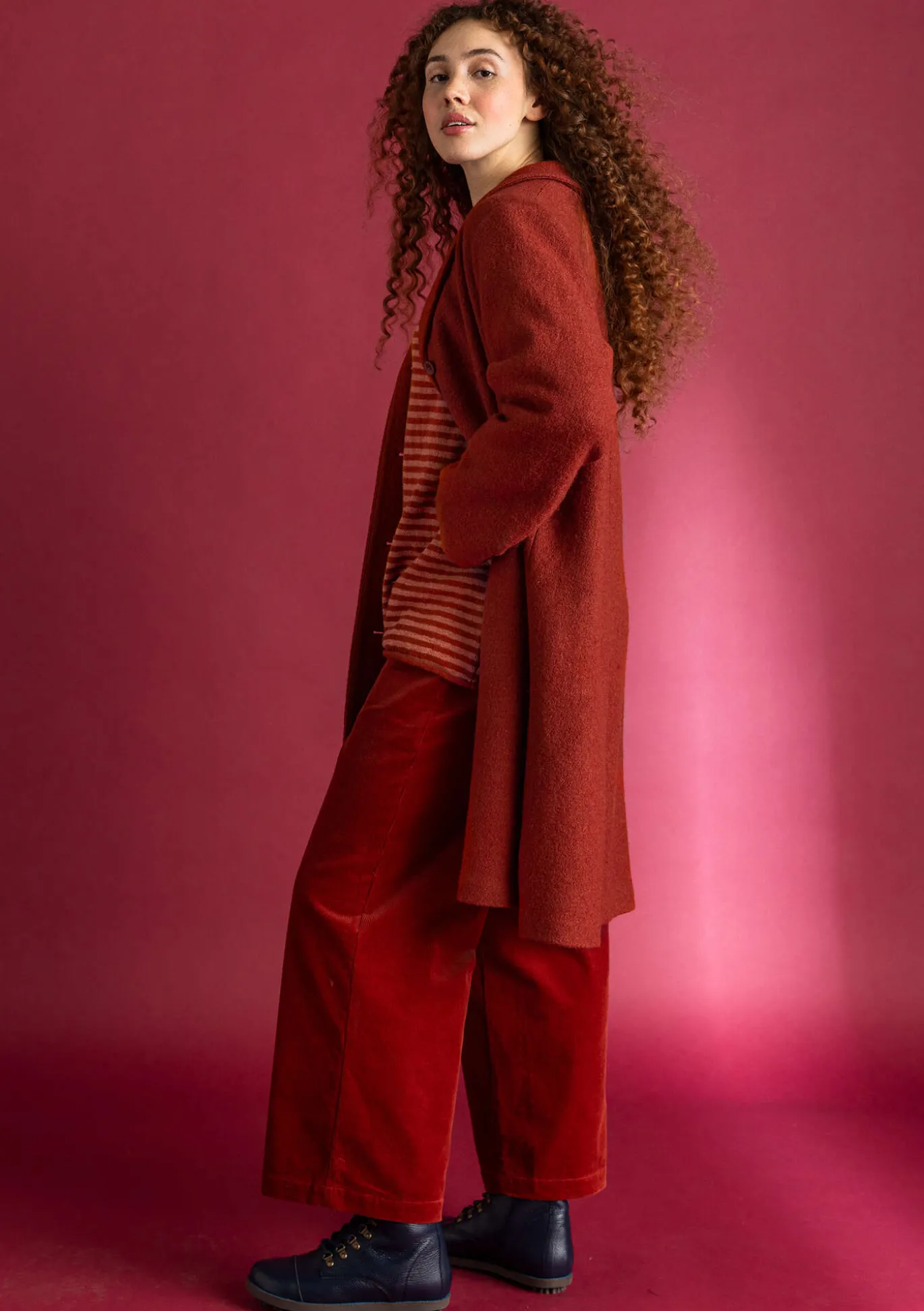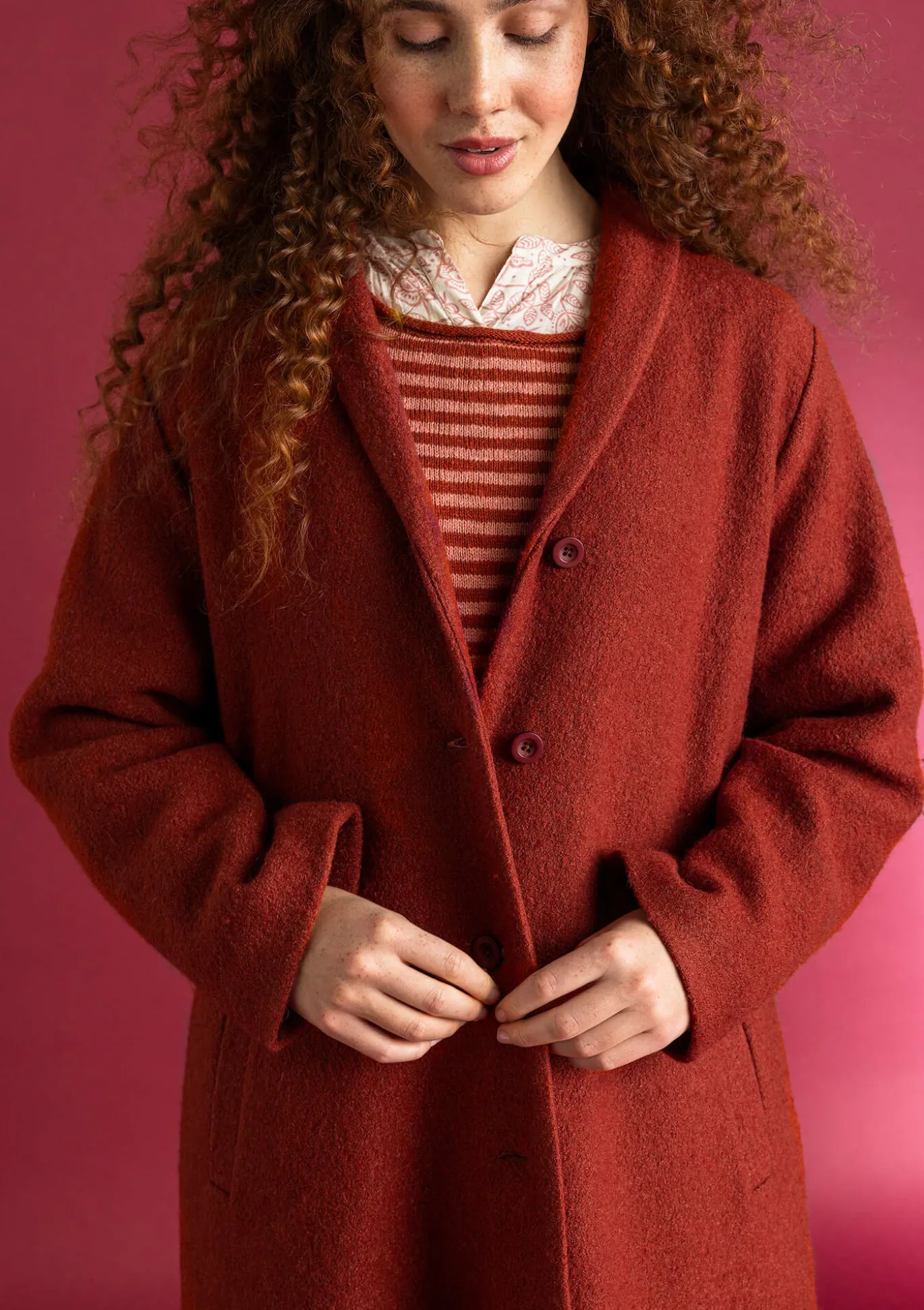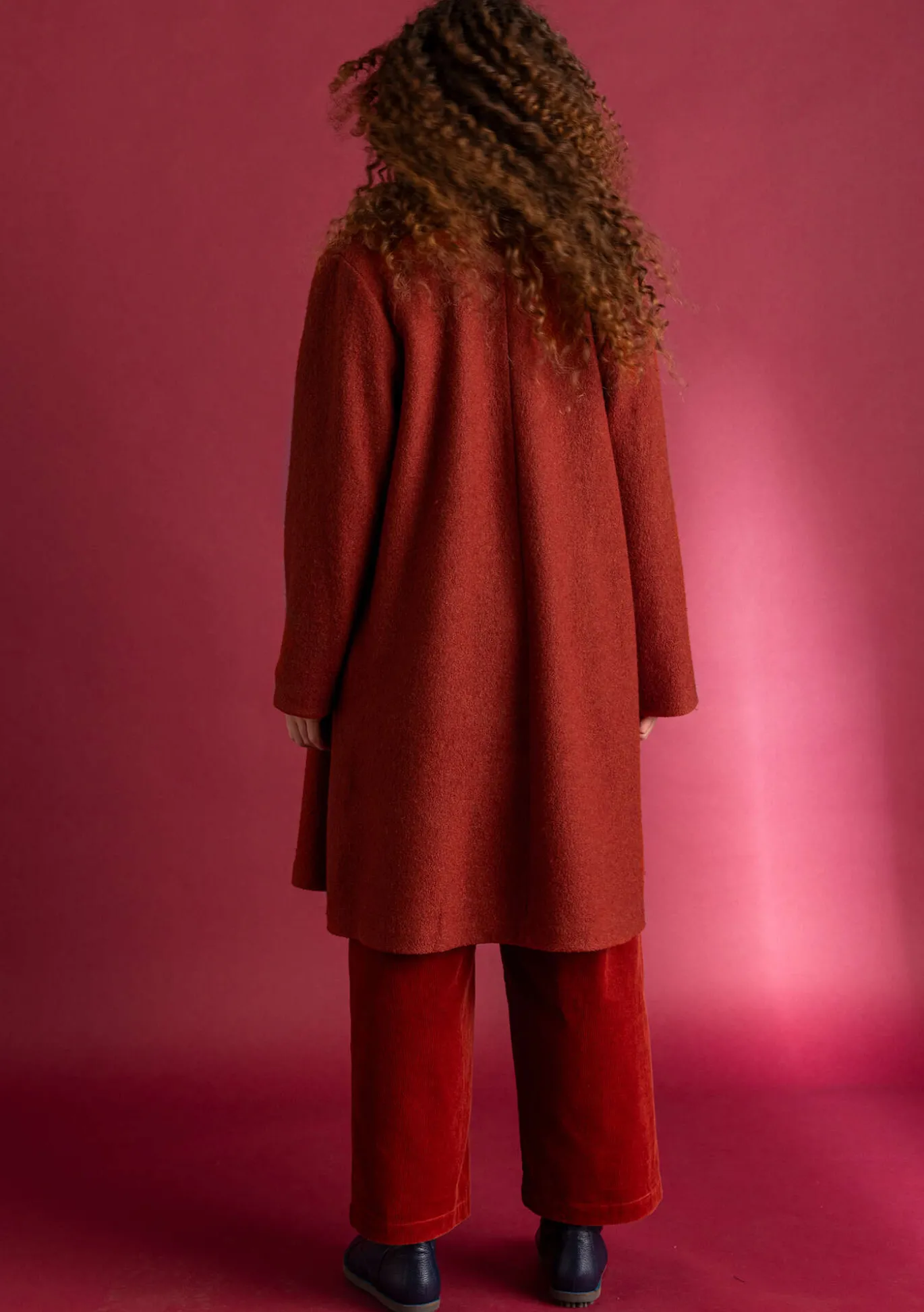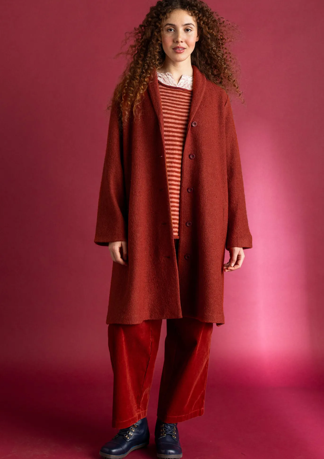 Mantel mit Schalkragen, Teilfutter und hübsch unregelmäßiger Struktur dank Bouclégarn. Einfarbiges Modell mit praktischen Taschen.