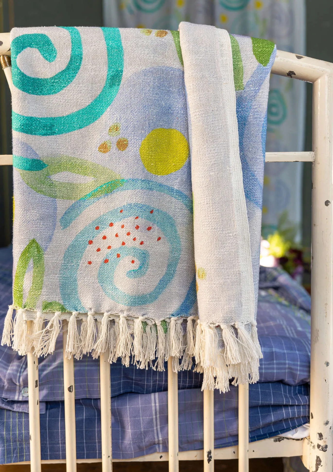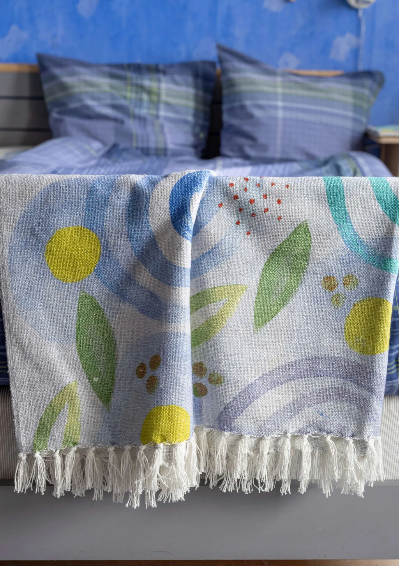 Hübsches Plaid aus handgewebter Bio-Baumwolle. Verspieltes digital gedrucktes Muster und Fransen an den Schmalseiten.