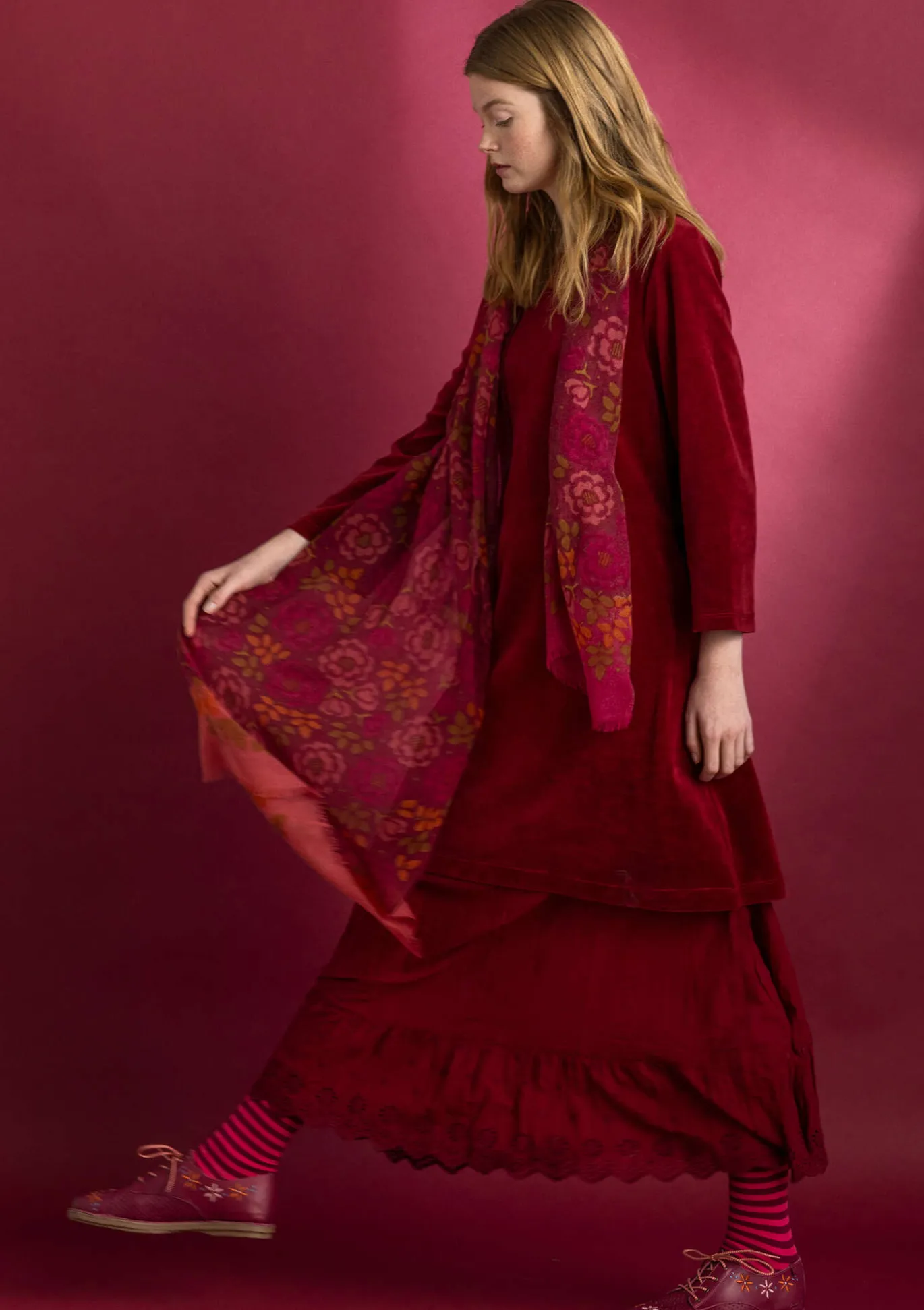 Bedruckter Schal aus einer weichen, wärmenden Wollqualität. Wunderschöner Rosenprint, der hübsch in die kontrastierenden Blenden an den Schmalseiten ausläuft.