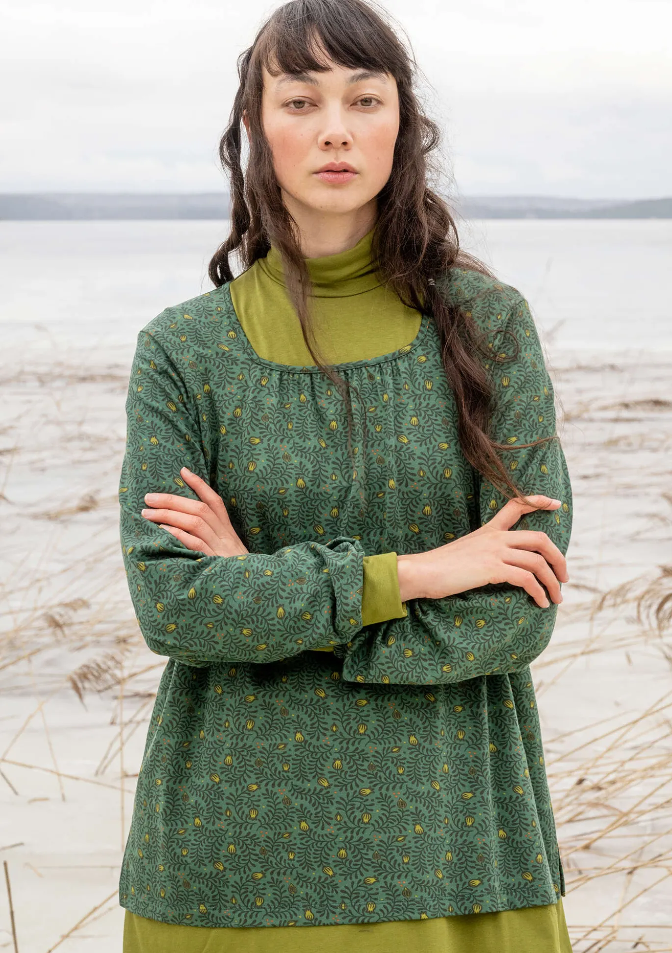 Leicht ausgestelltes Jerseyshirt mit kleinem Musterprint. Modell mit langen, leicht pludrigen Ärmeln. Softer eckiger Ausschnitt mit Kräuselung vorne.