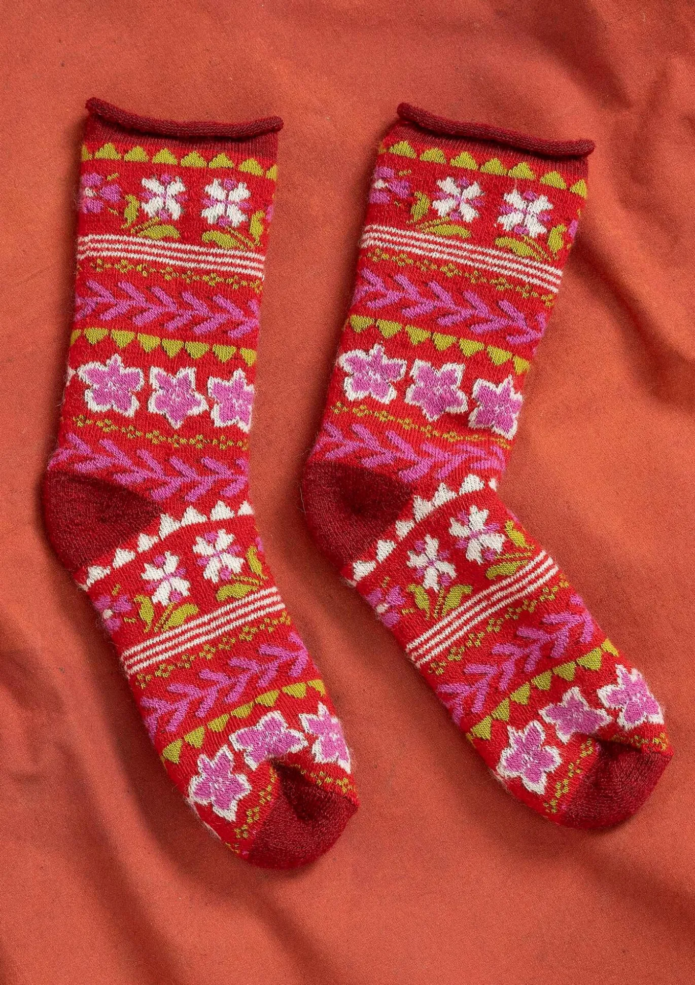 Wunderbare Wintersocken aus weichem Wollfrottee im Jacquardstrick. Schön auf das übrige Sortiment abgestimmt.