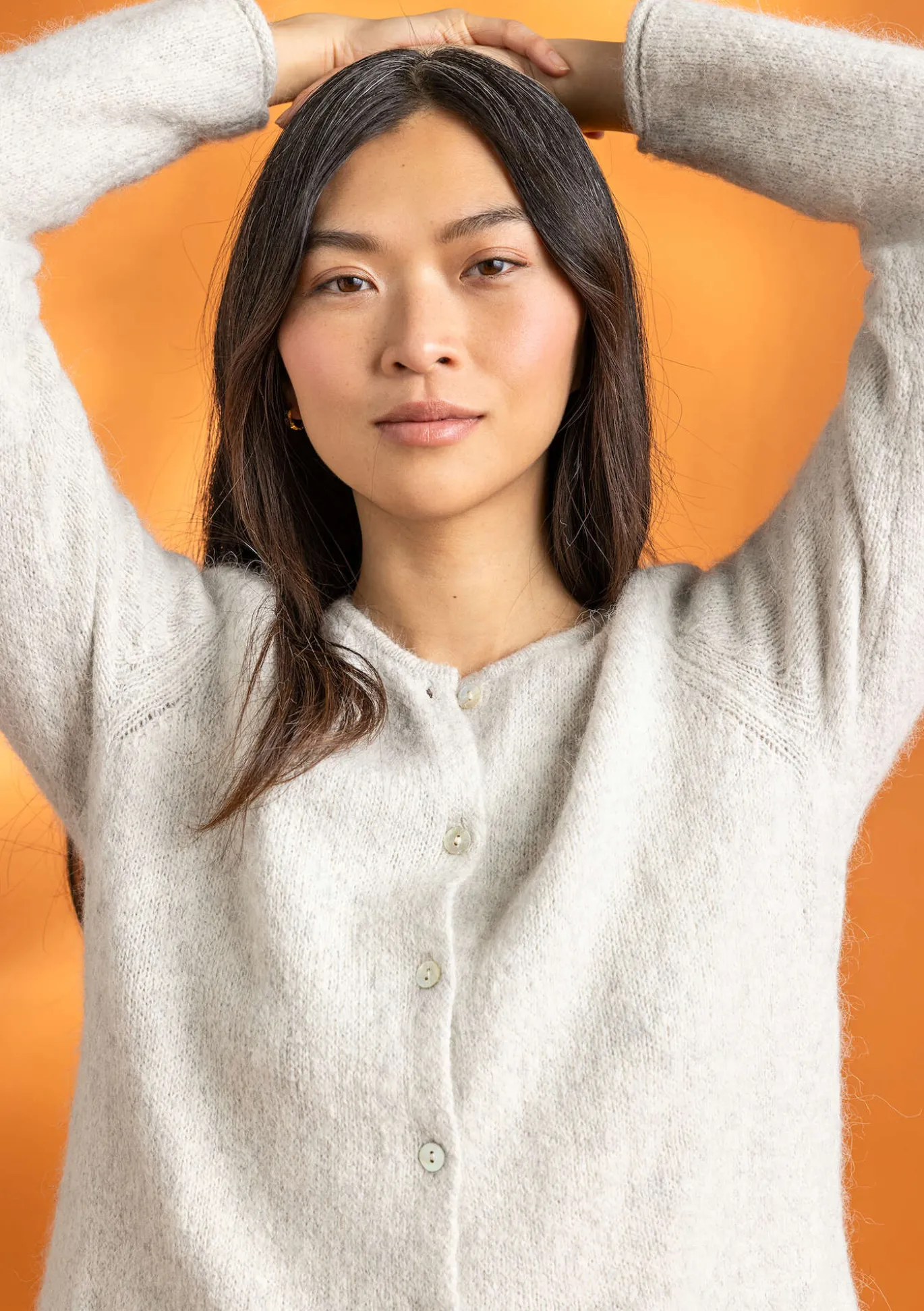 Vielseitige Strickjacke aus unserem weichen, melierten Mischgarn mit Alpakawolle. Taschen vorne. Feine Rollkanten an Ärmelabschlüssen und Saum. Lange Ärmel und hübsche Perlmuttknöpfe.