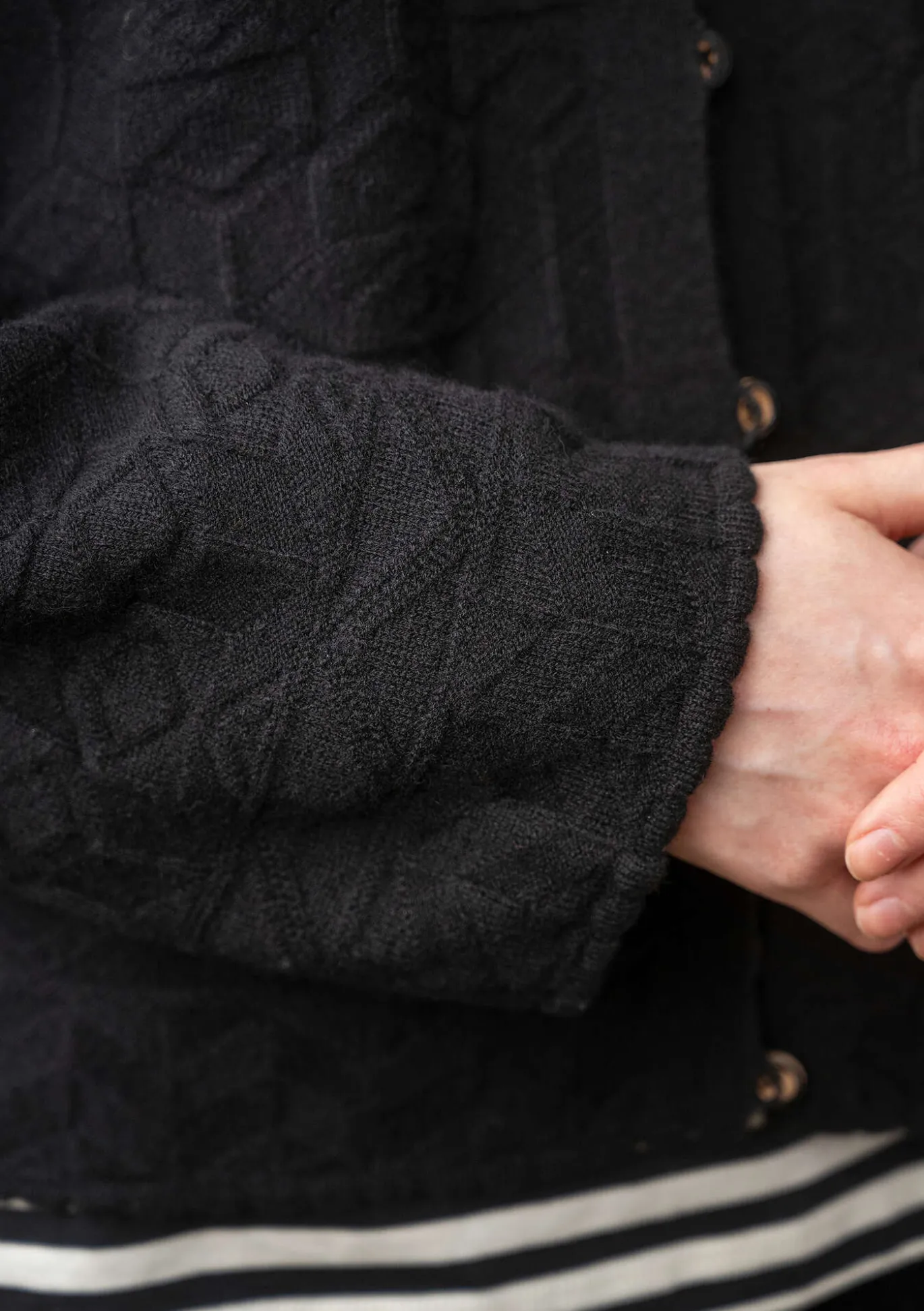Strickjacke mit Sternen und Bordüren im Strukturstrick. Modell mit rundem Ausschnitt, leicht verkürzter Ärmellänge und kleinen Seitenschlitzen. Dekorative Bogenkante an Ausschnitt, Ärmeln und Saum. Holzknöpfe mit lackiertem Rand.