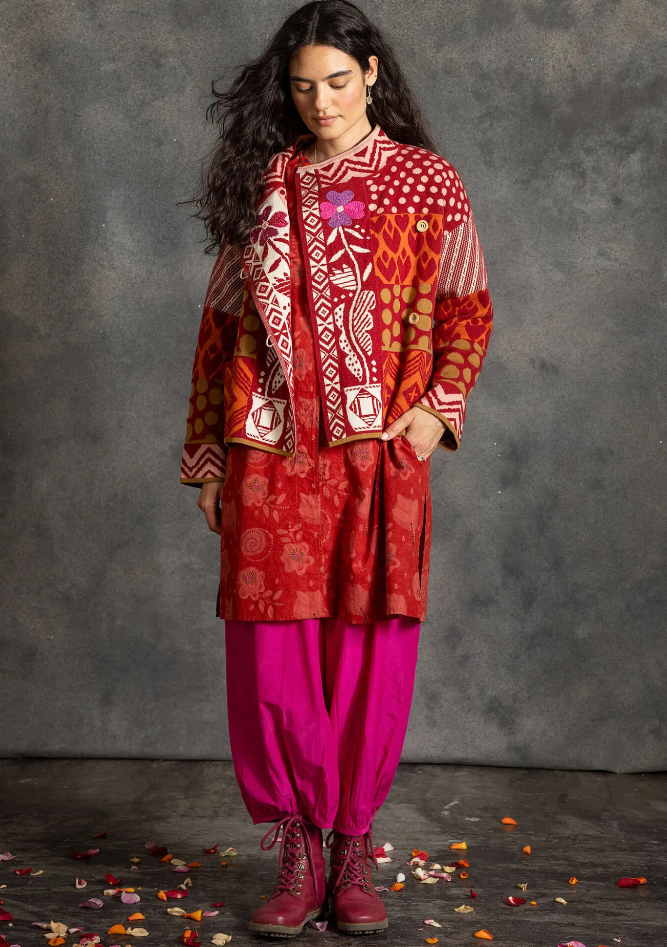 Etwas kürzer geschnittene Jacquardstrickjacke, überlappend gearbeitet und mit zwei Holzknöpfen zu schließen. Herrlich gemustertes Modell mit 3/4-Ärmeln und Stehkragen. Eine eingesetzte Tasche und eine von Hand gestickte Blume auf beiden Seiten.