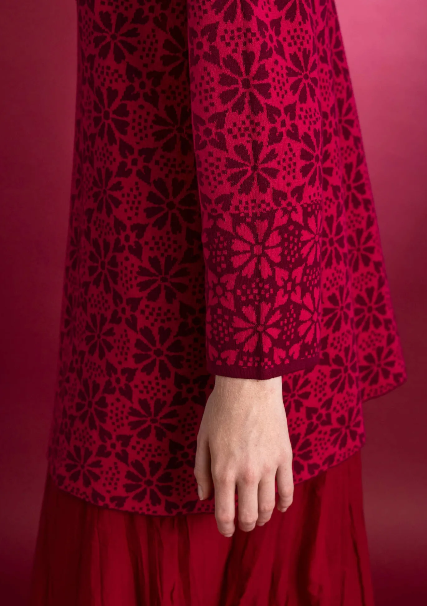 Jacquardstrick-Tunika mit leicht verkürzten Ärmeln. V-Ausschnitt vorne und hinten. An den Ärmeln Blenden in vertauschten Farben, die wie eine dezente Bordüre wirken.