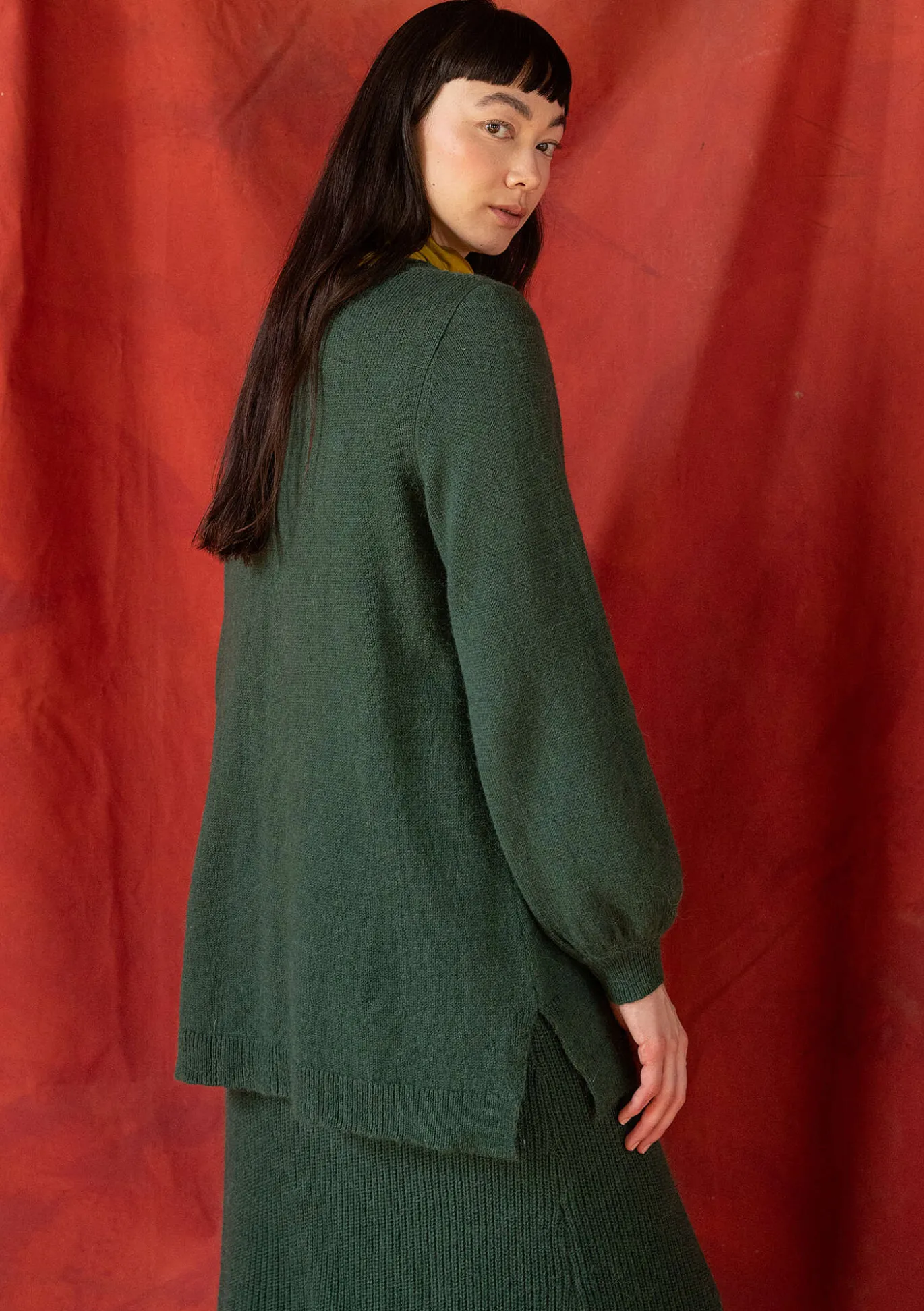 Glattstricktunika aus weichem Alpakawollgemisch, mit Seitenschlitzen. Pludrige lange Ärmel und Rundhalsausschnitt mit Rollkante. Rippbündchen an Ärmelabschlüssen und Saum.