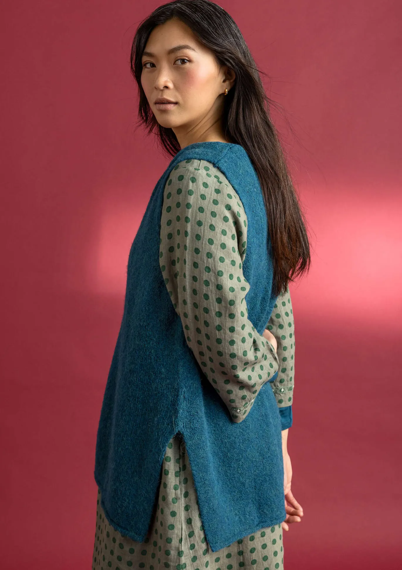 Etwas länger geschnittene Strickweste. Modell aus unserem weichen, flauschigen Melangegarn. Perlmuttknöpfe mit Häkelösen vorne und Schlitze an den Seiten.