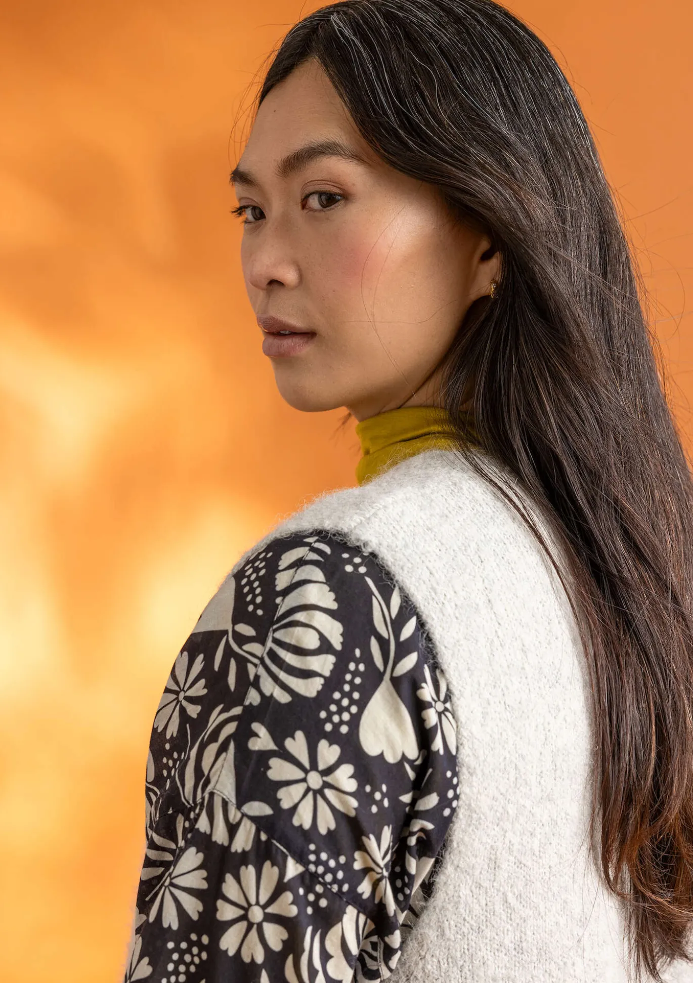 Etwas länger geschnittene Strickweste. Modell aus unserem weichen, flauschigen Melangegarn. Perlmuttknöpfe mit Häkelösen vorne und Schlitze an den Seiten.