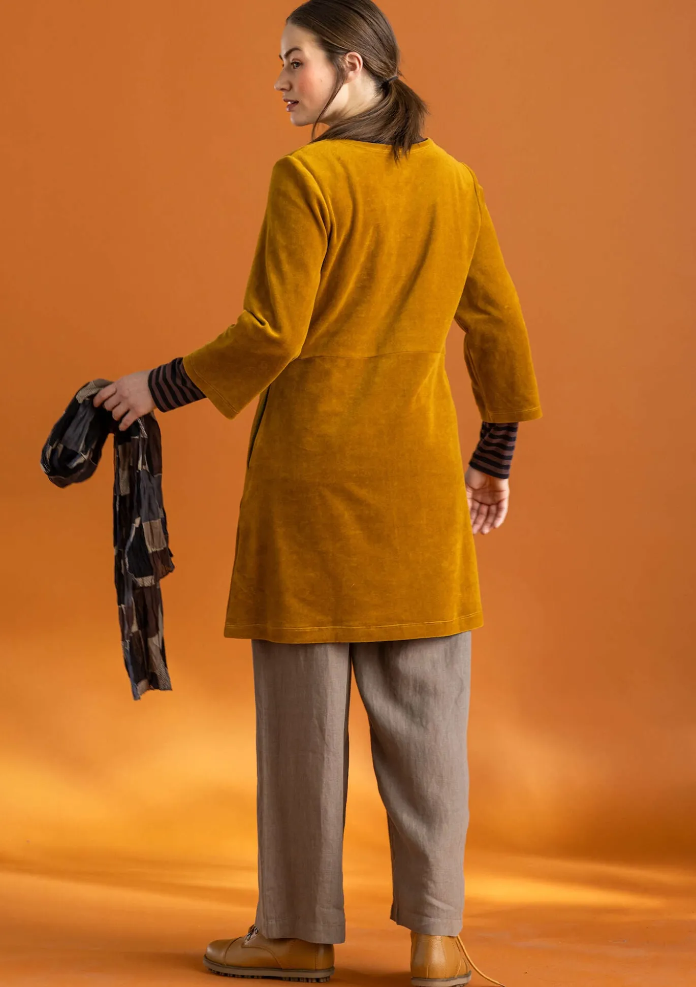 Vielseitiges Modell aus schönem Velours. Oben anliegend und unten etwas weiter geschnitten. 3/4-Ärmel und verdeckte seitliche Taschen.