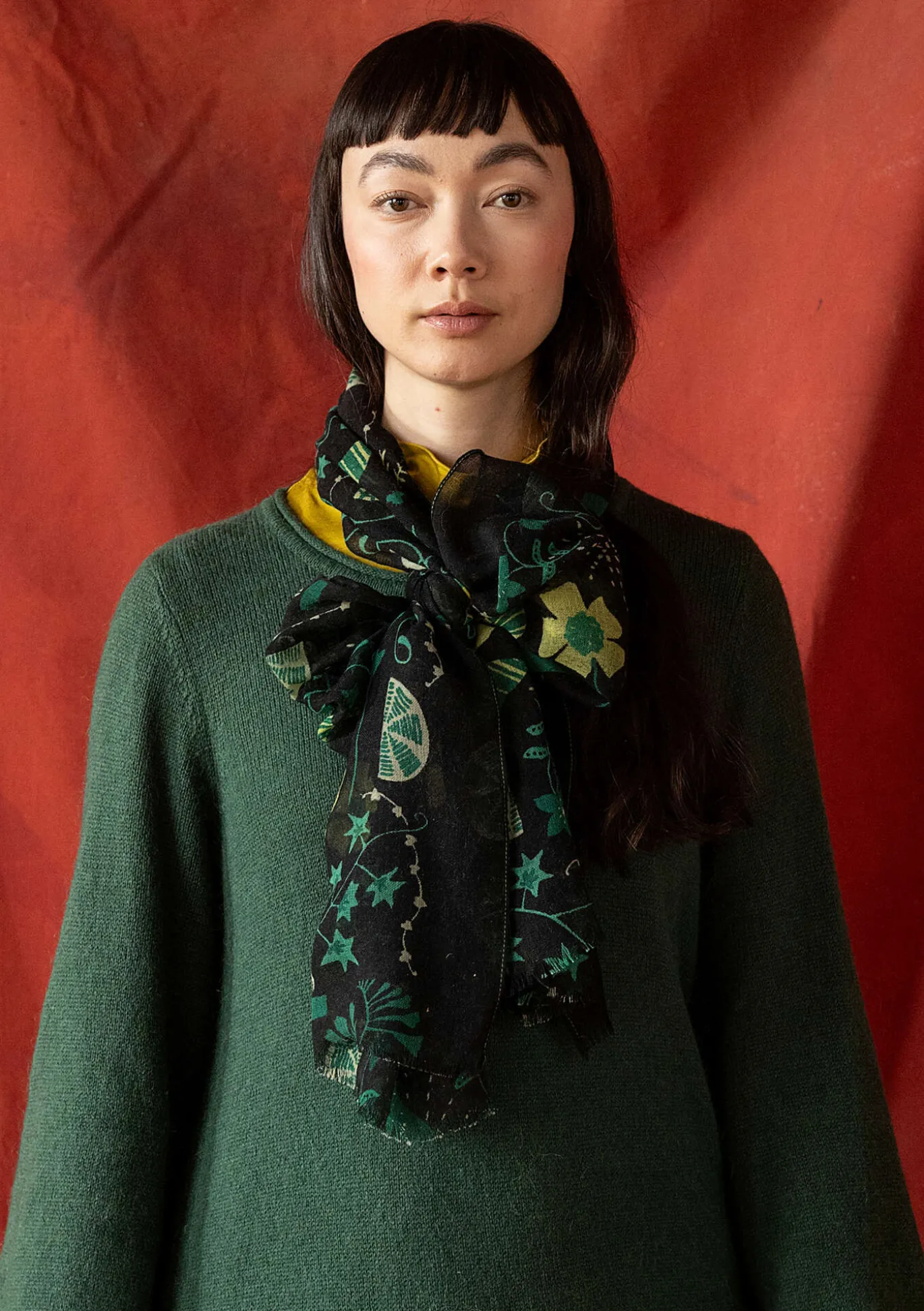 Wollschal mit prächtigem Musterprint. Mit kontrastierendem Garn gesäumte Längsseiten. Ungesäumte Schmalseiten mit kurzen, natürlichen Fransen.