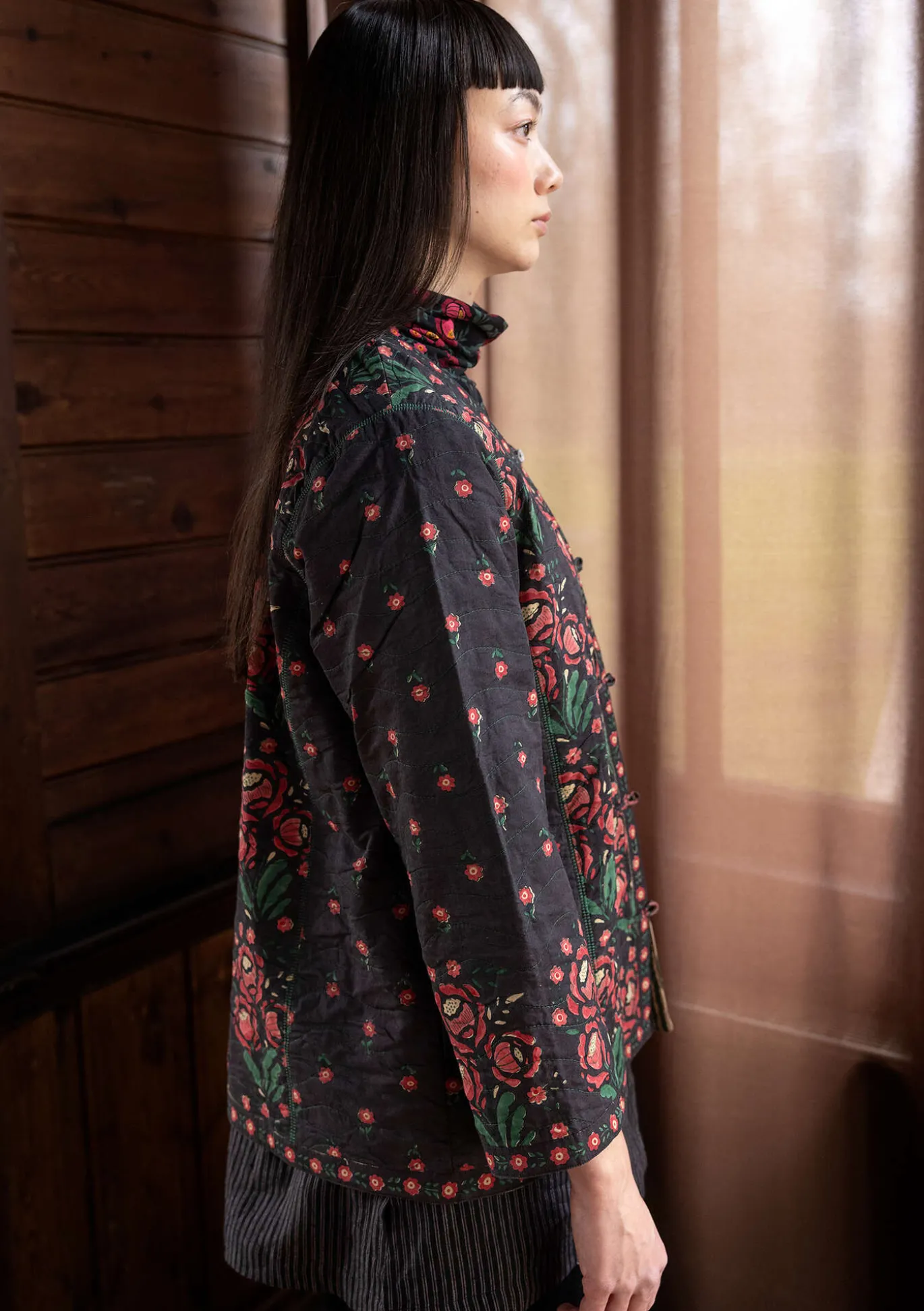 Gerade geschnittene Wendejacke mit Blockdruck und langen Ärmeln. Gestepptes Modell mit einer leichten Schicht aus Baumwollflanell. Seitentaschen und eine aufgesetzte Tasche. Aufwendig mit einer Stickblüte auf dem Rücken gearbeitet. Ganz klassisch mit Stoffknöpfen im China-Stil zu schließen.