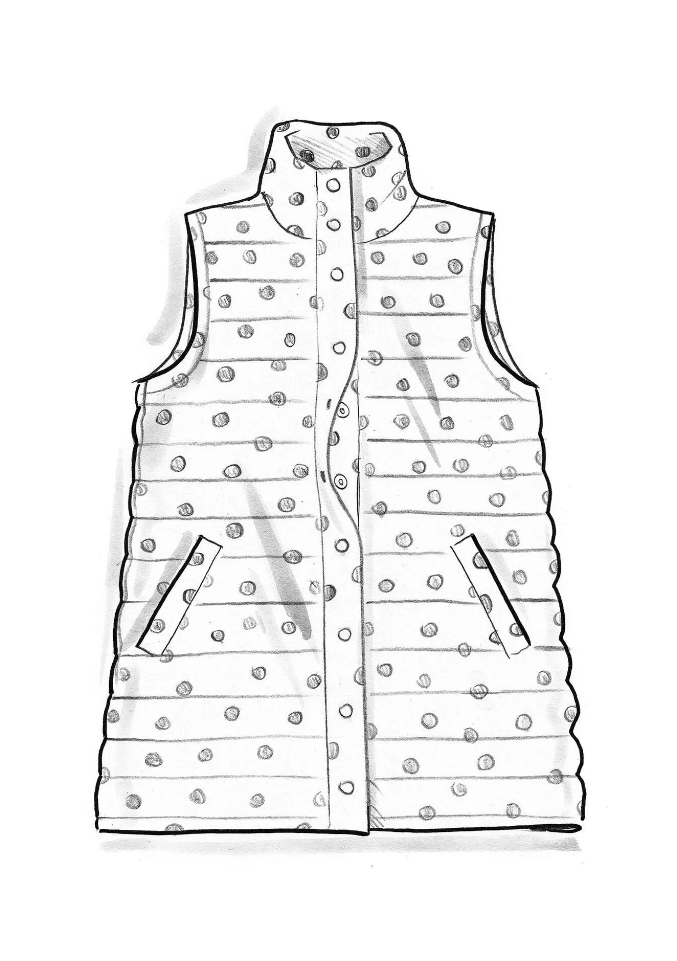 Leicht wattierte Weste mit hohem Kragen und Punktedruck. Druckknöpfe vorne und Paspeltaschen an den Seiten. Schön über und unter der Jacke zu tragen – oder auch über einem Strickpullover.